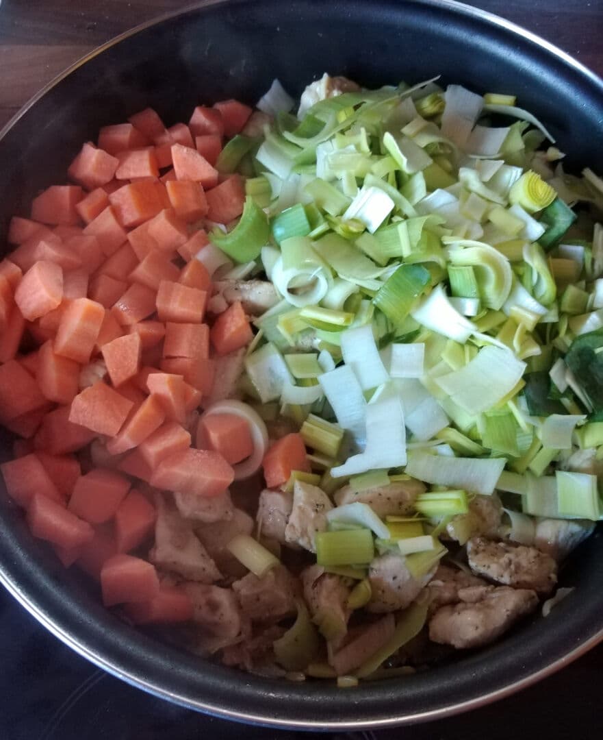 - Rajouter les morceaux de poireaux, les dés de carottes et le bouquet garni. Laisser mijoter de nouveau 20 minutes. Touiller de temps en temps.