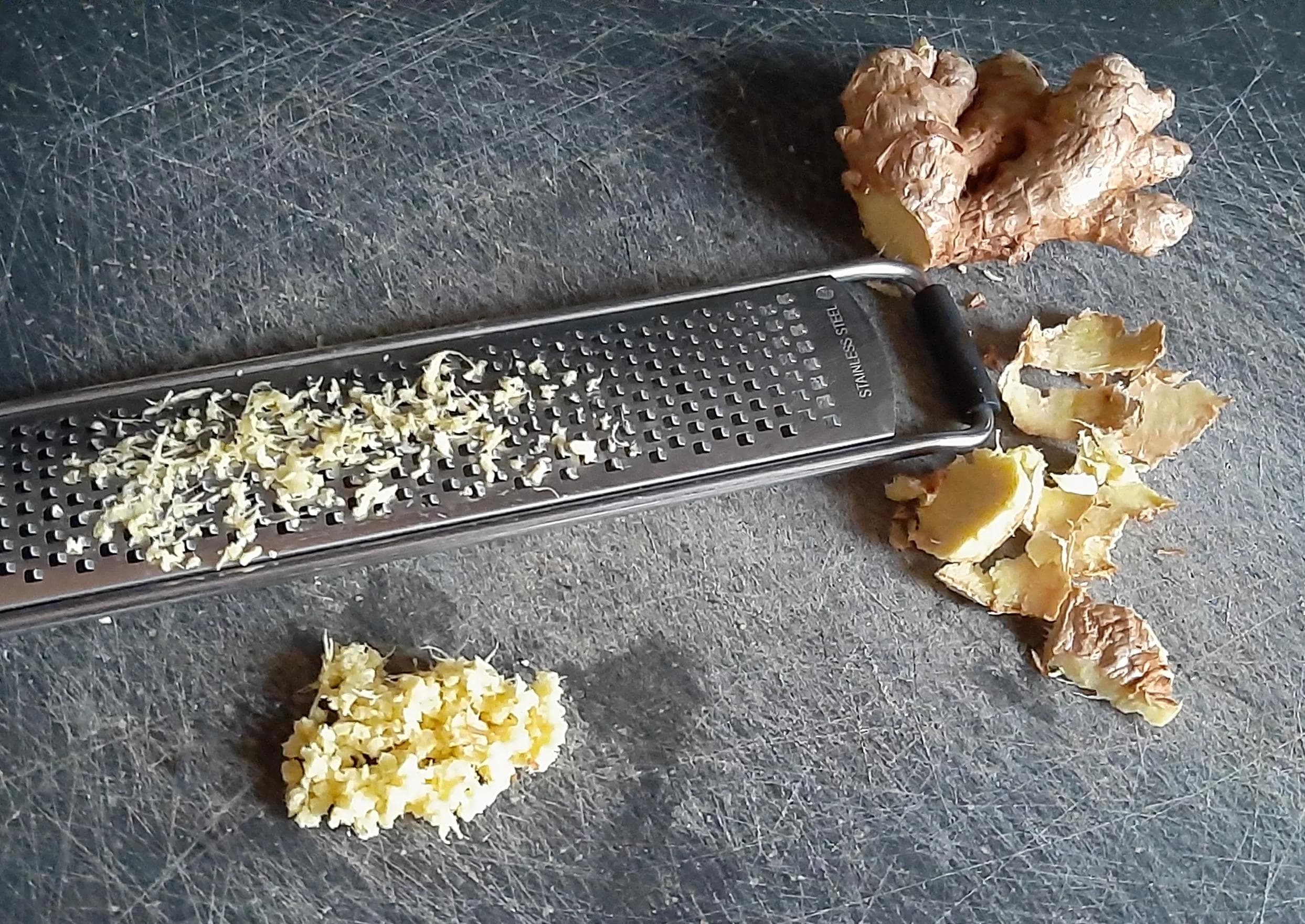 - Eplucher un peu de gingembre frais et râper l'équivalent de deux cuillères à café.