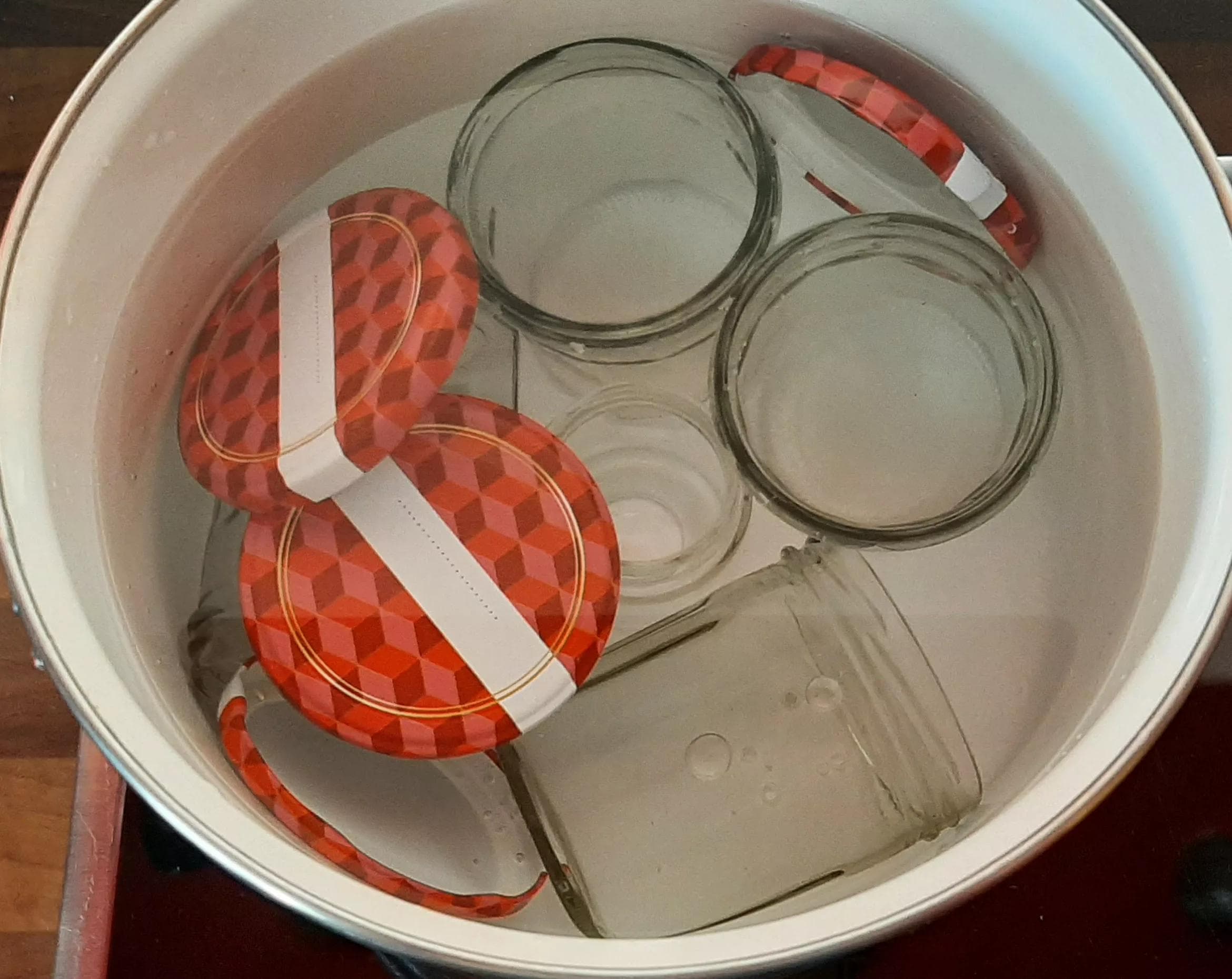 - Pendant la macération, stériliser les pots de confiture. Pour cela, mettre les pots et les couvercles dans une casserole remplie d'eau (ils doivent être complètement immergés). Porter à ébullition et faire bouillir 10 minutes.