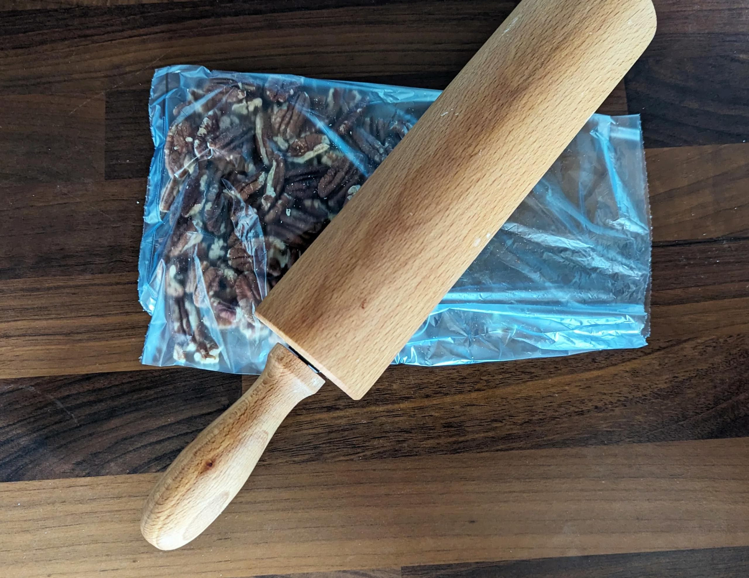 - Commencer par mettre les noix de pécan dans un sachet de congélation. Les écraser grossièrement avec un rouleau à pâtisserie.