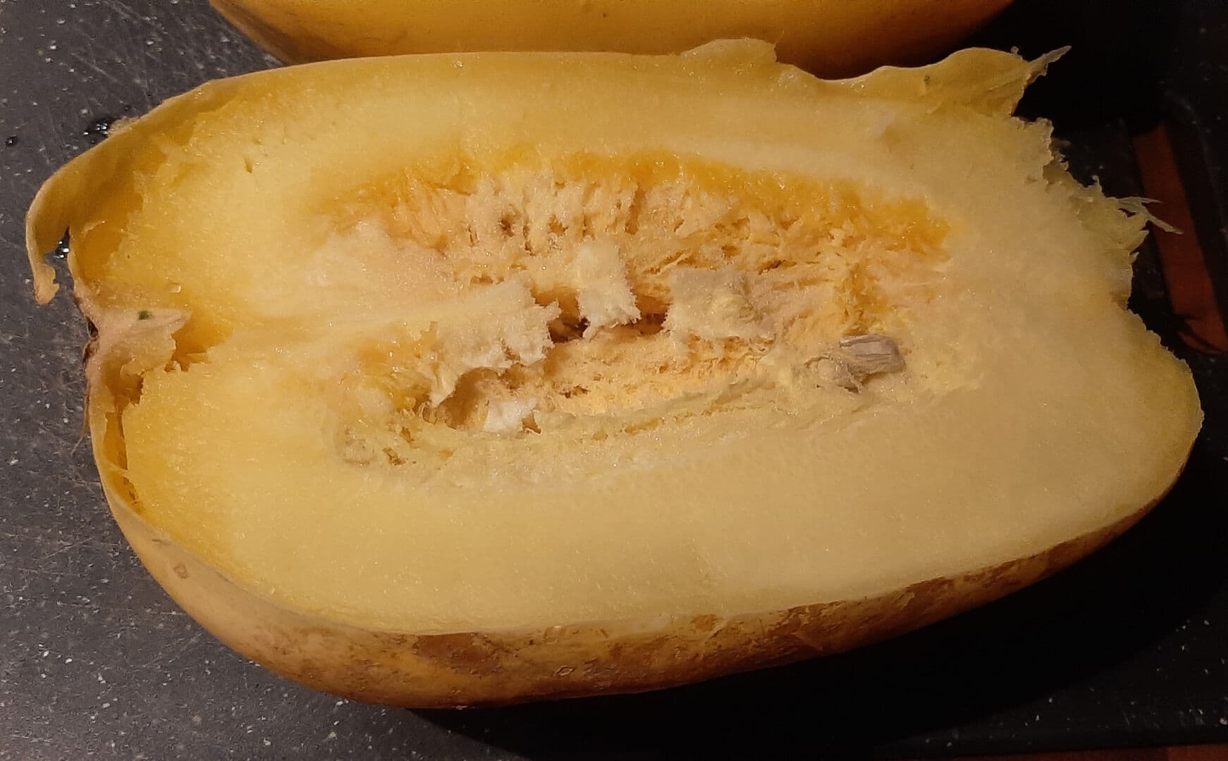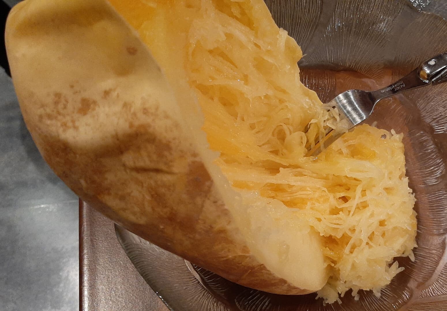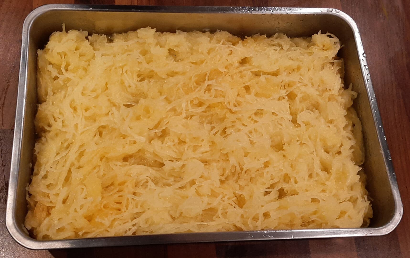 - Gratter la chair de la courge avec une fourchette pour récupérer les fameux spaghettis et réserver.