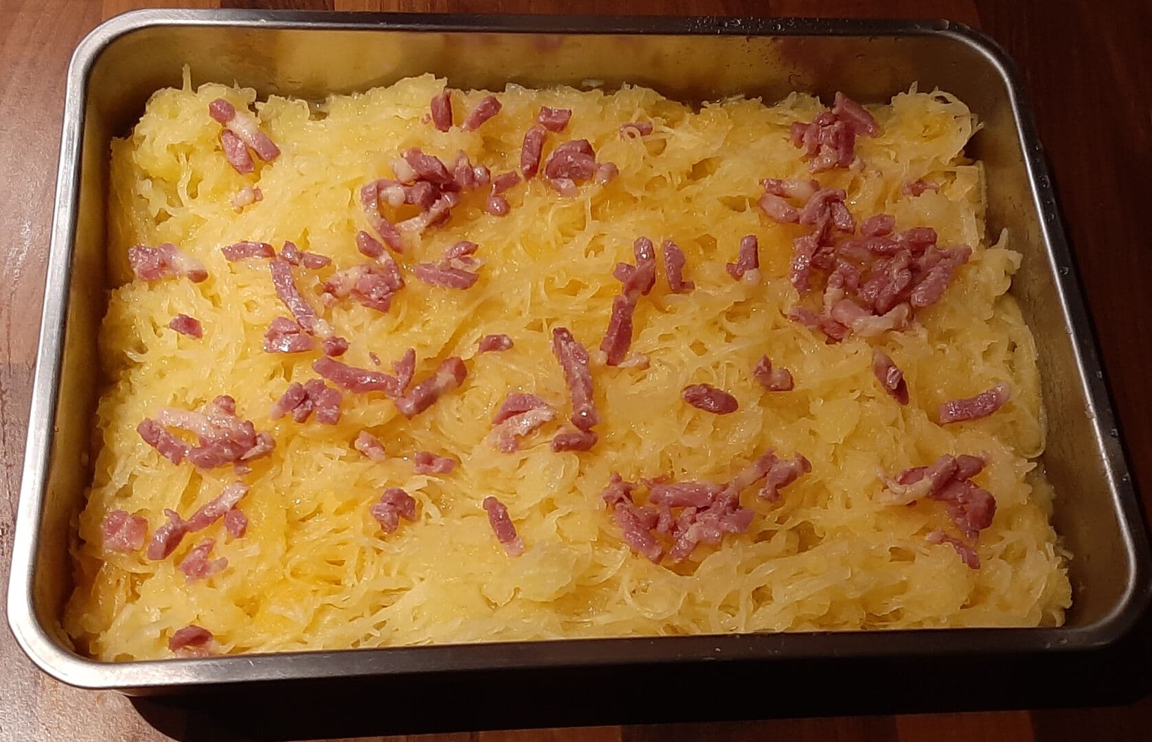 Il existe de nombreuses sortes de courges. Des rondes, allongées, petites, grosses, rouges, vertes, etc... Mais une seule donne les filaments lorsque sa chair est cuite : La courge spaghetti !Elle est aussi appelée spaghetti végétal. Elle pèse entre 2 et 4kg, et mesure entre 20 et 30 cm de long. Elle se récolte lorsqu’elle est bien jaune. La coloration de la courge spaghetti est un bon indicateur pour savoir lorsqu’elle est mûre.Cette recette de gratin est light et très facile à faire. Vous pouvez enlever les lardons pour la rendre végétarienne.