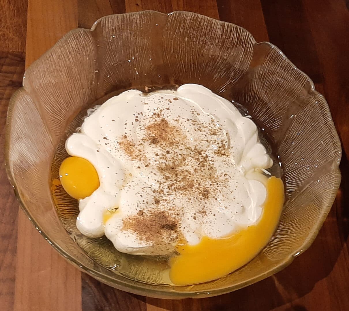 - Dans un saladier, mettre les œufs, la crème légère, la muscade, le sel et le poivre.