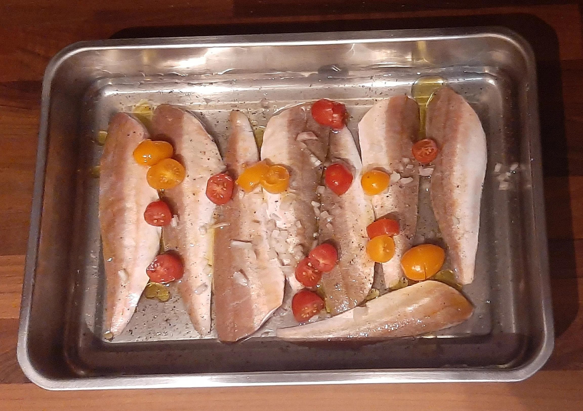- Rajouter dessus les morceaux d'échalotte et les tomates cerises coupées en deux. Finir avec le sel, le poivre, le vin blanc et une cuillère à soupe d'huile d'olive.