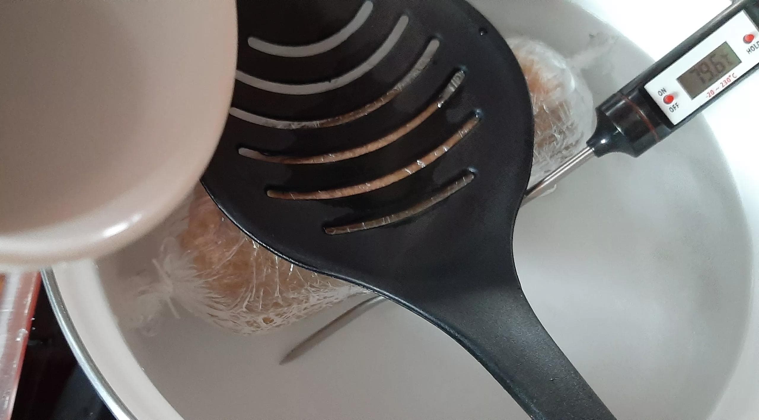 - Préparer une tasse avec de l'eau froide. Puis, mettre la ballotine dans la casserole d'eau chaude. L'eau doit la recouvrir entièrement. Comme elle flotte, utiliser une écumoire pour la maintenir sous le niveau de l'eau.