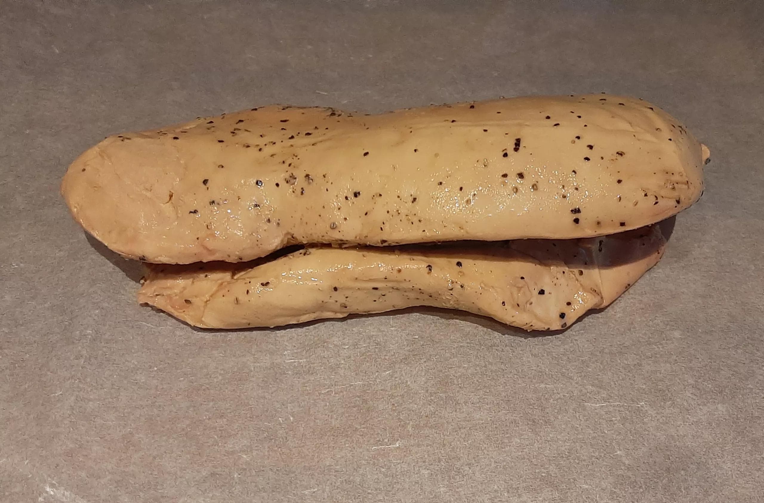 - Enlever ensuite le papier sulfurisé et mettre le foie gras cru sur un film alimentaire.