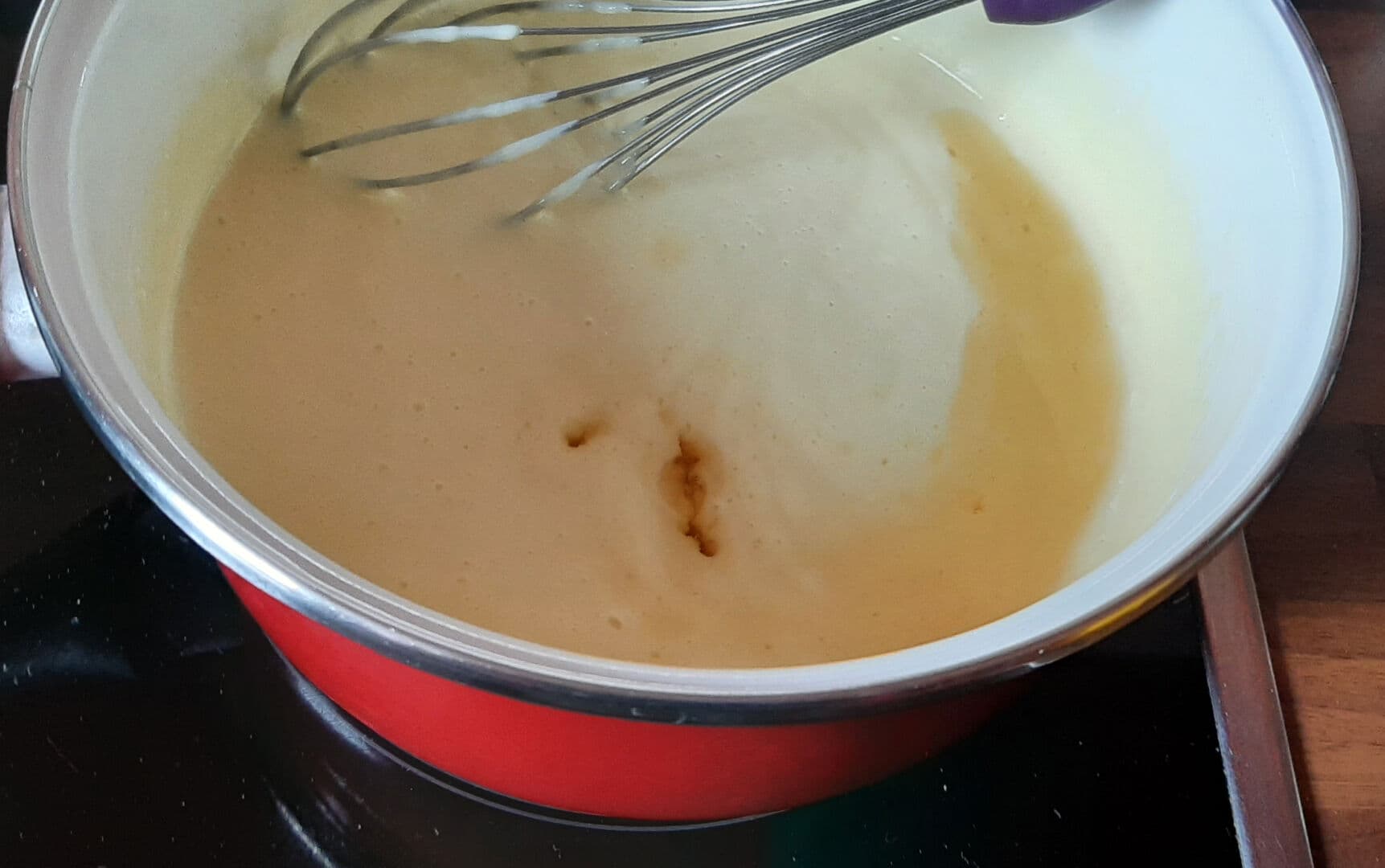 - Dès que le lait bout, verser la moitié du lait progressivement dans le mélange, tout en remuant.