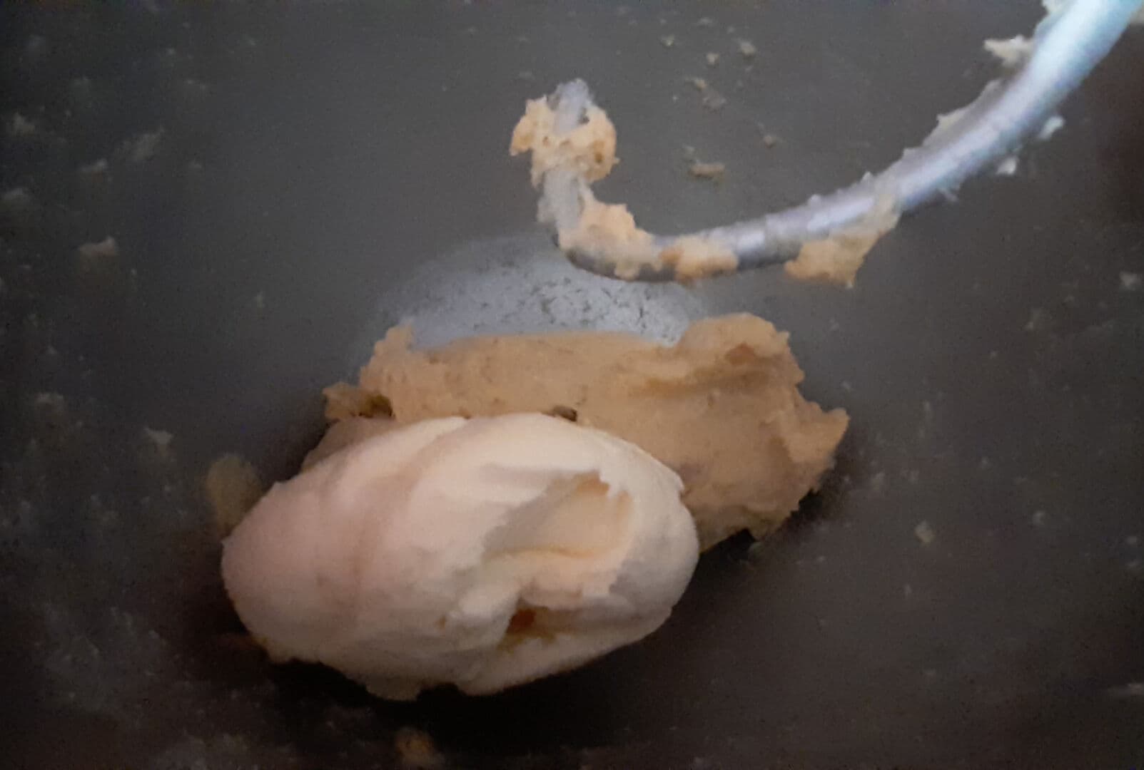 - Rajouter le beurre pommade puis continuer à pétrir la pâte à vitesse N°2 jusqu'à ce qu'elle soit lisse et qu'elle n'adhère plus aux parois de la cuve du robot. Une bonne vingtaine de minutes pour moi. Si la pâte colle aux bords car pas assez de volume de pâte, n'hésitez pas à arrêter le robot et utiliser une corne pour ramener tout au centre.