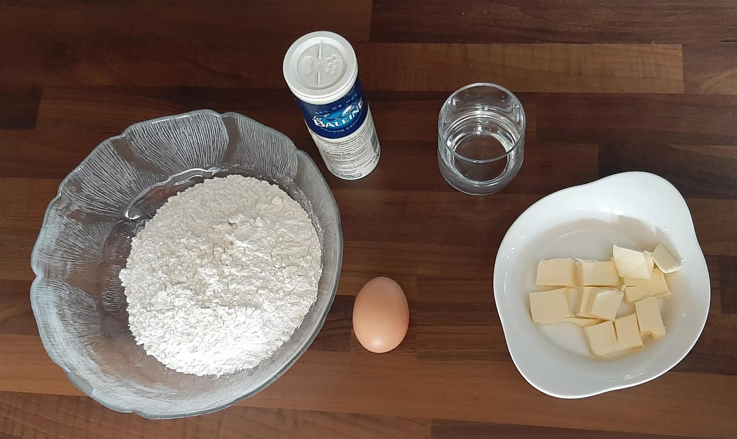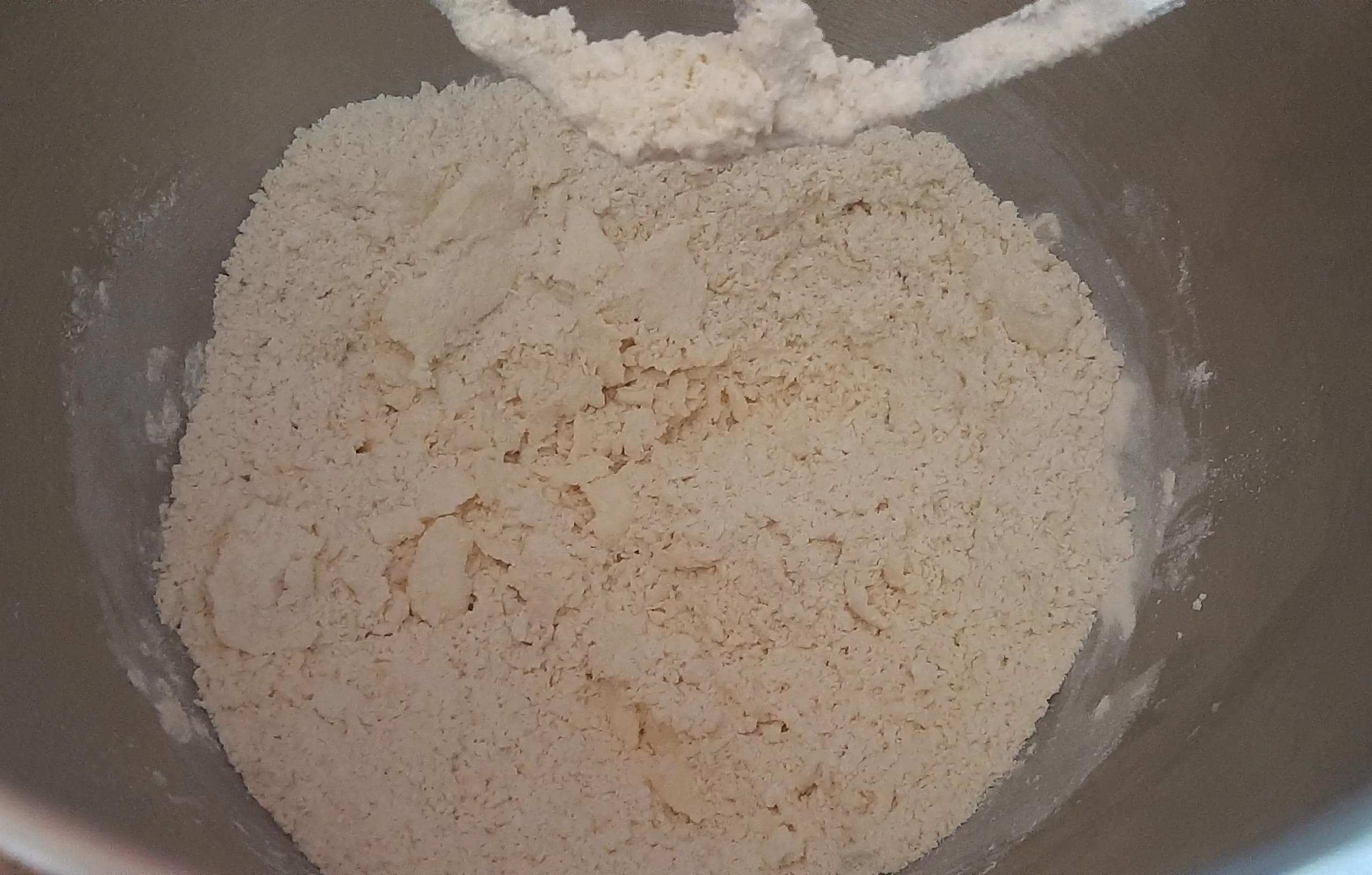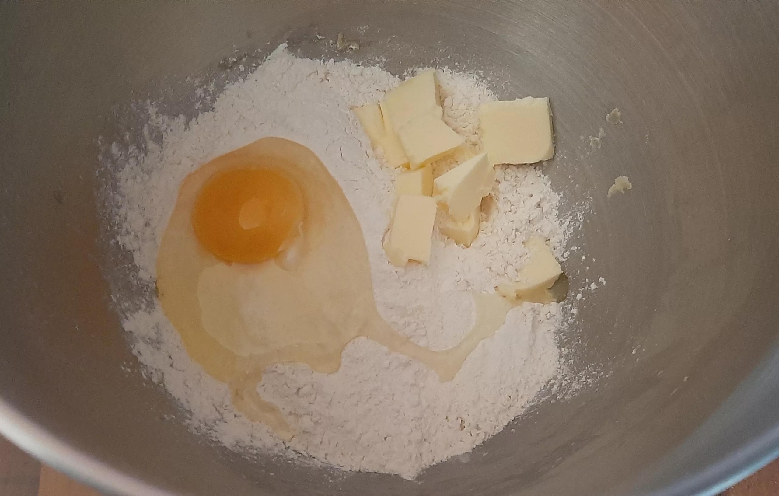 - Dans la cuve du robot, mettre la farine, le beurre, le sel et l'œuf.
