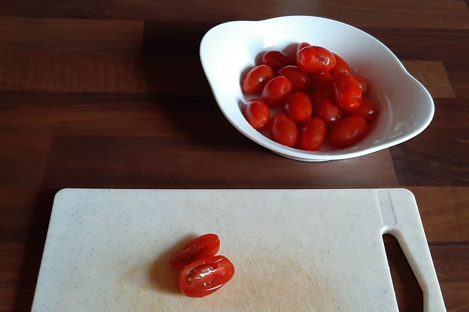 - Laver les tomates cerises, les sécher, les couper en deux et les réserver.