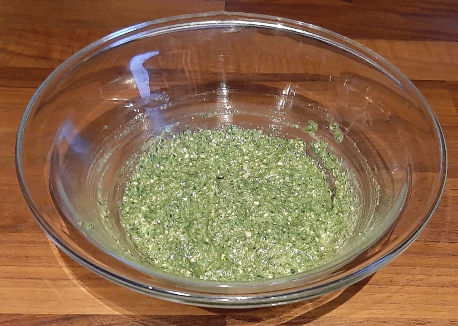 - Dans un cul de poule, mettre le pesto, l'eau de cuisson et l'huile d'olive.