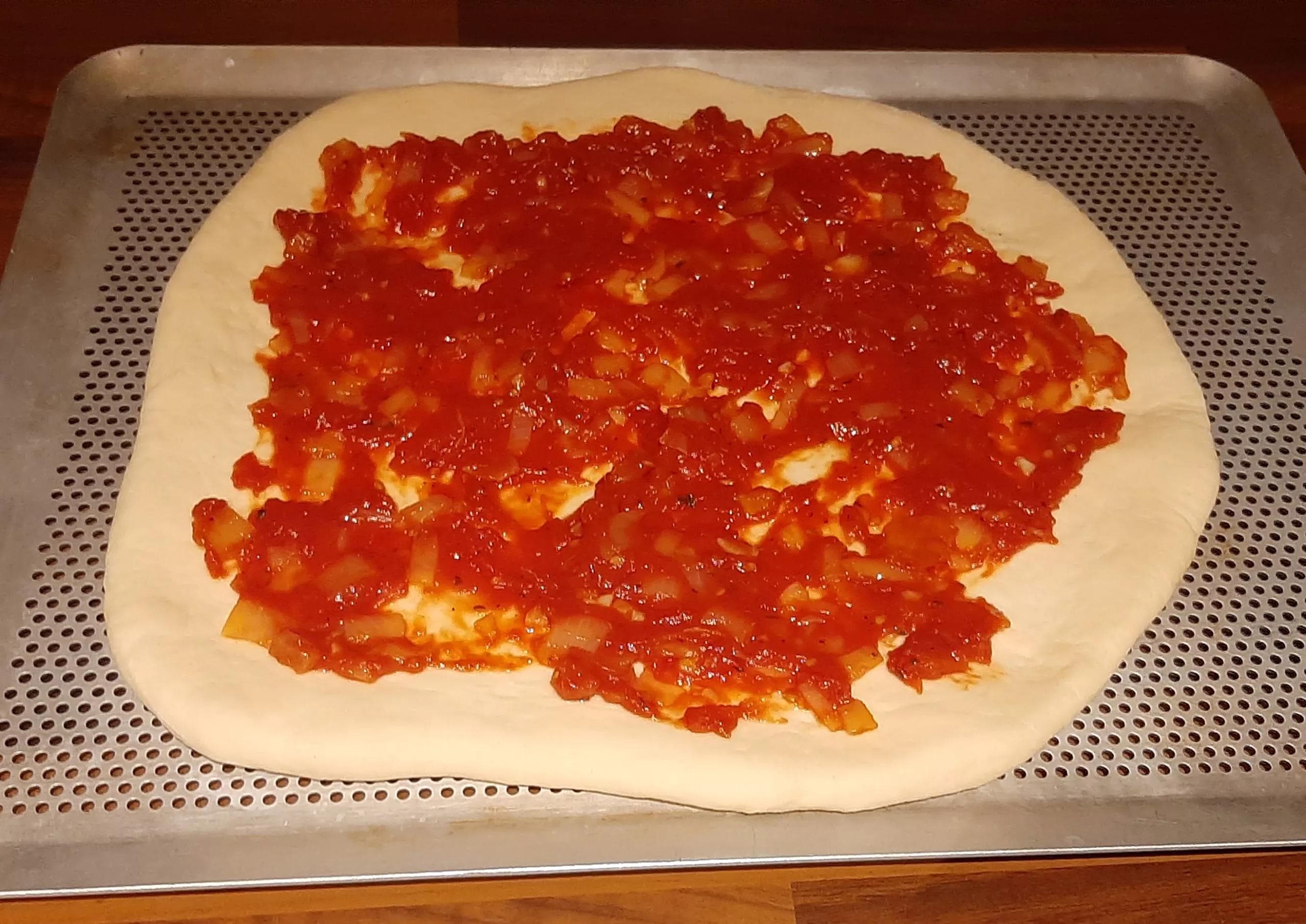 - Ensuite, étaler la sauce tomate. Pas trop sinon votre pâte sera humide. On doit toujours voir la pâte à pizza.