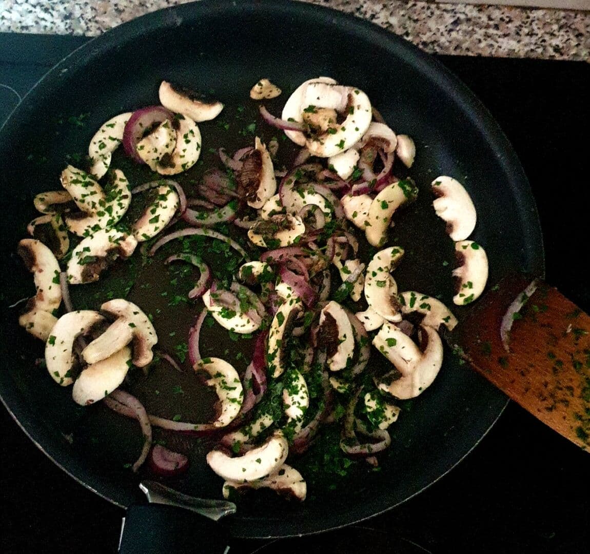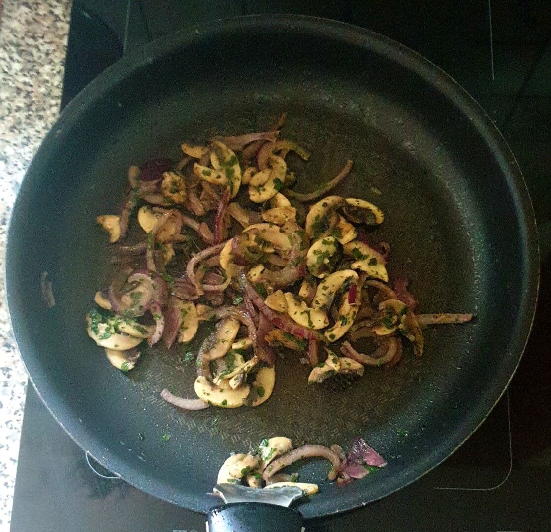 - Faire cuire jusqu'à ce que les oignons deviennent colorés puis ajouter les champignons préalablement découpes en morceaux.