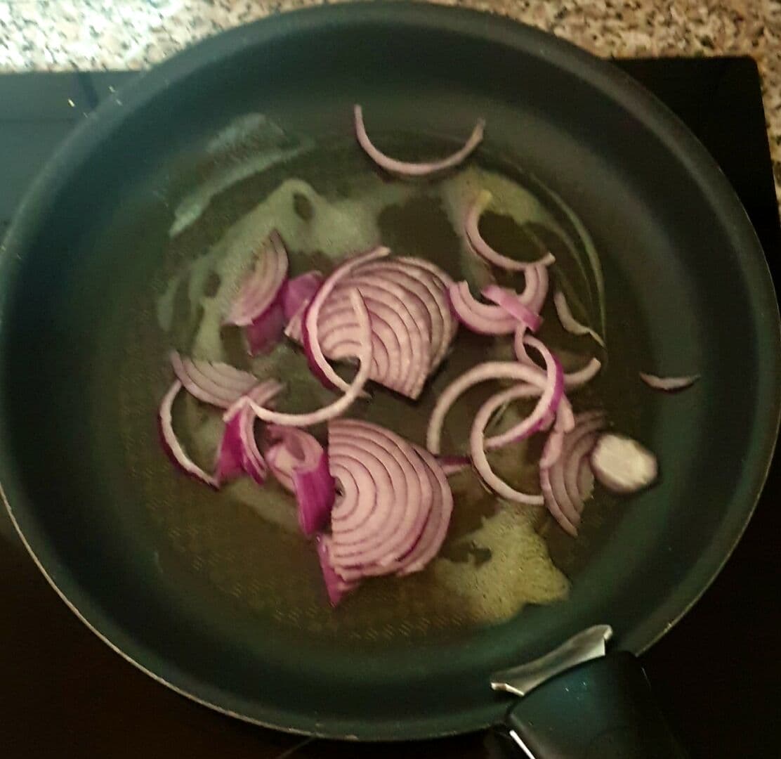 - Préchauffer le four à 200°C et, pendant ce temps, mettre du beurre à chauffer dans une poêle à feu moyen et y ajouter l'oignon rouge découpé en fines lamelles.