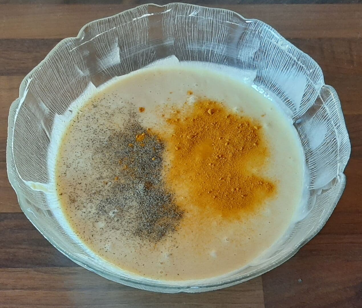 - Mélanger puis ajouter le sel, le poivre et le curcuma (pour la couleur)
