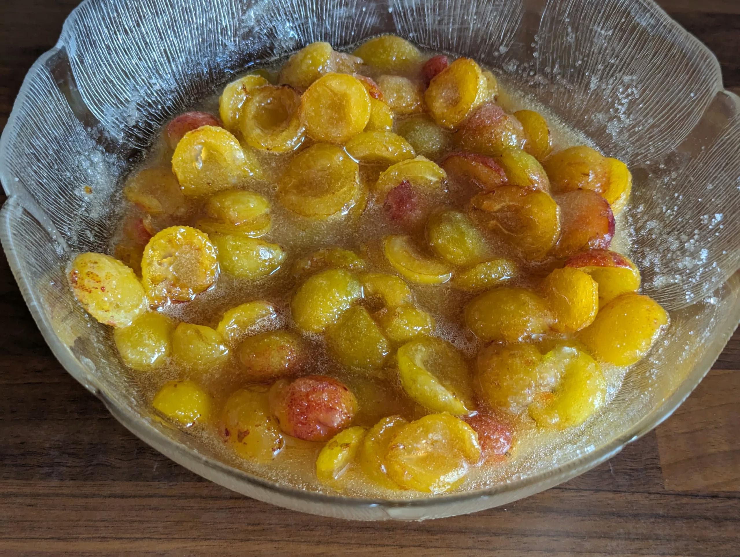 - Dans un saladier, mettre les mirabelles coupées. Le peser et préparer 60% du poids en sucre. Me concernant, comme j'ai obtenu 550 gr de fruit, j'ai utilisé 330 gr de sucre.