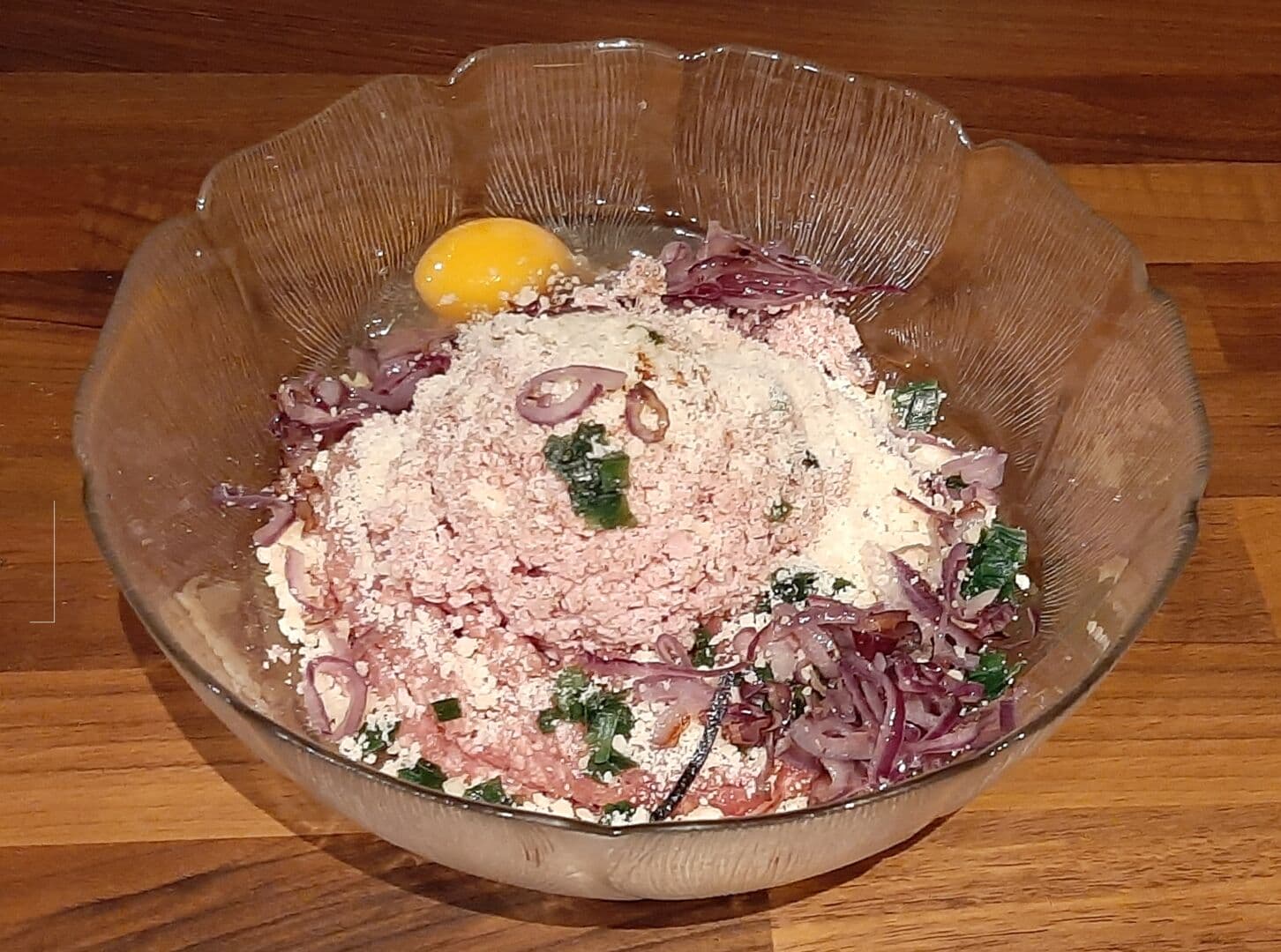 - Mettre dans un cul de poule la viande, la mortadelle, les oignons, le sel, le poivre, le persil, le piment, le parmesan et l'œuf