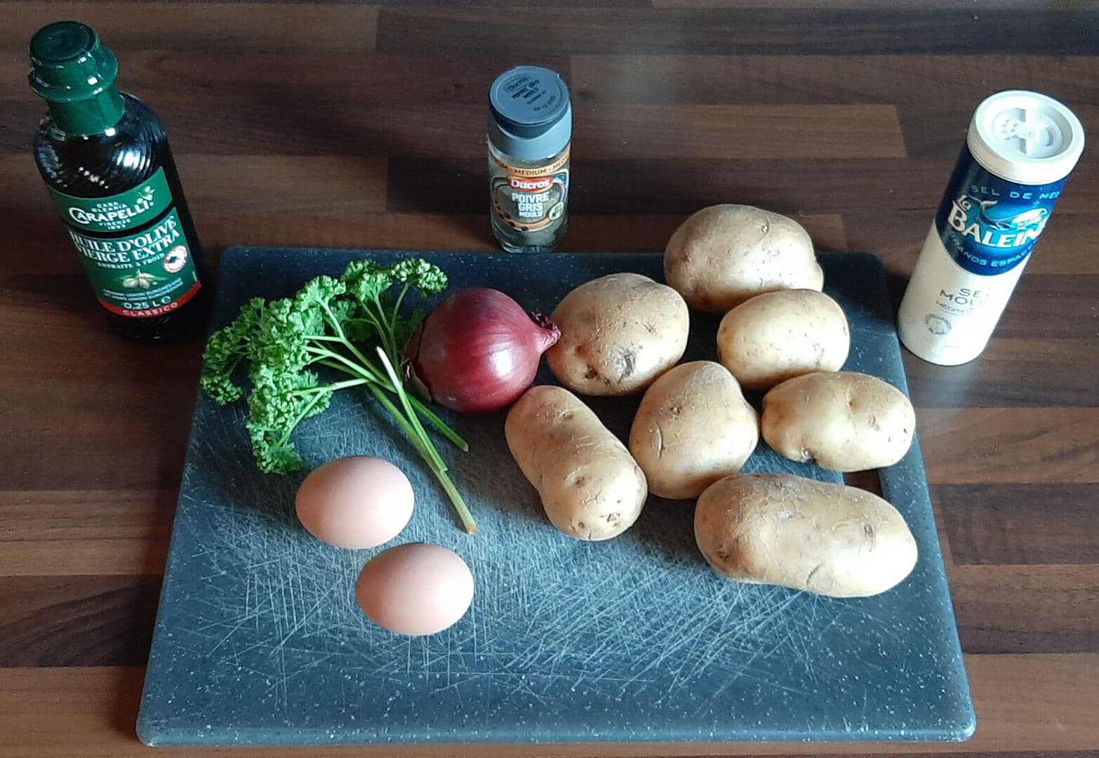 - Dans le saladier contenant les pommes de terre râpées, rajouter les œufs, le mélange oignon/persil, le sel et le poivre