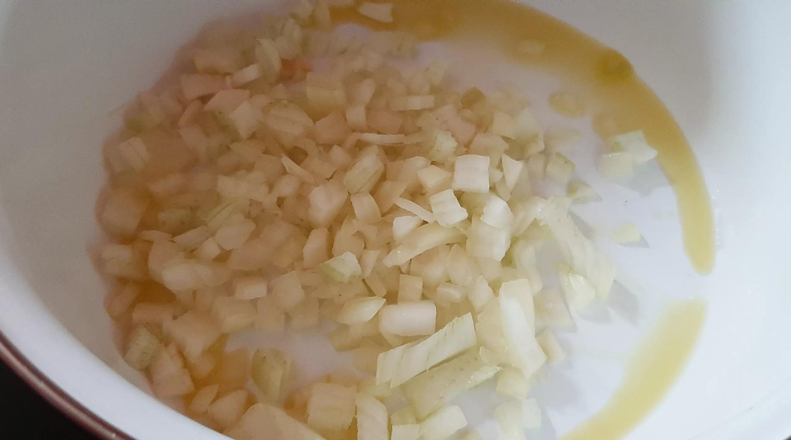 - Puis, éplucher l'oignon jaune et le couper en petits morceaux.