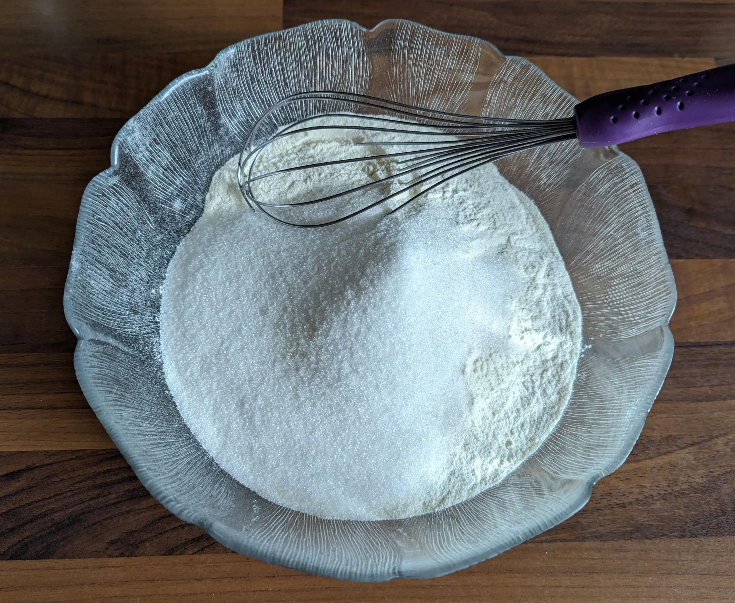 - Pendant ce temps, mélanger dans un saladier, la farine, le sucre et le sel.