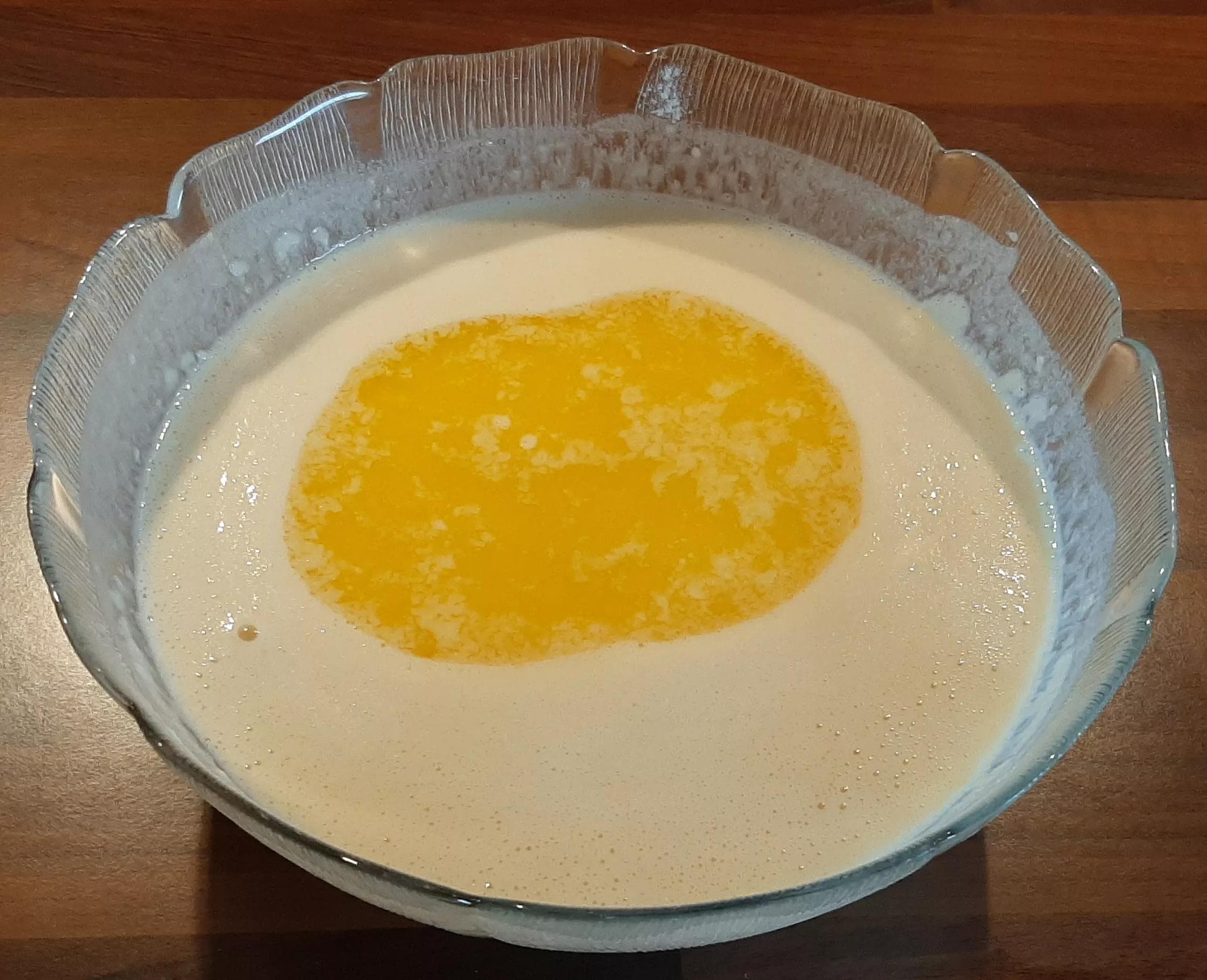 - Faire fondre le beurre au micro-ondes et le rajouter au mélange.