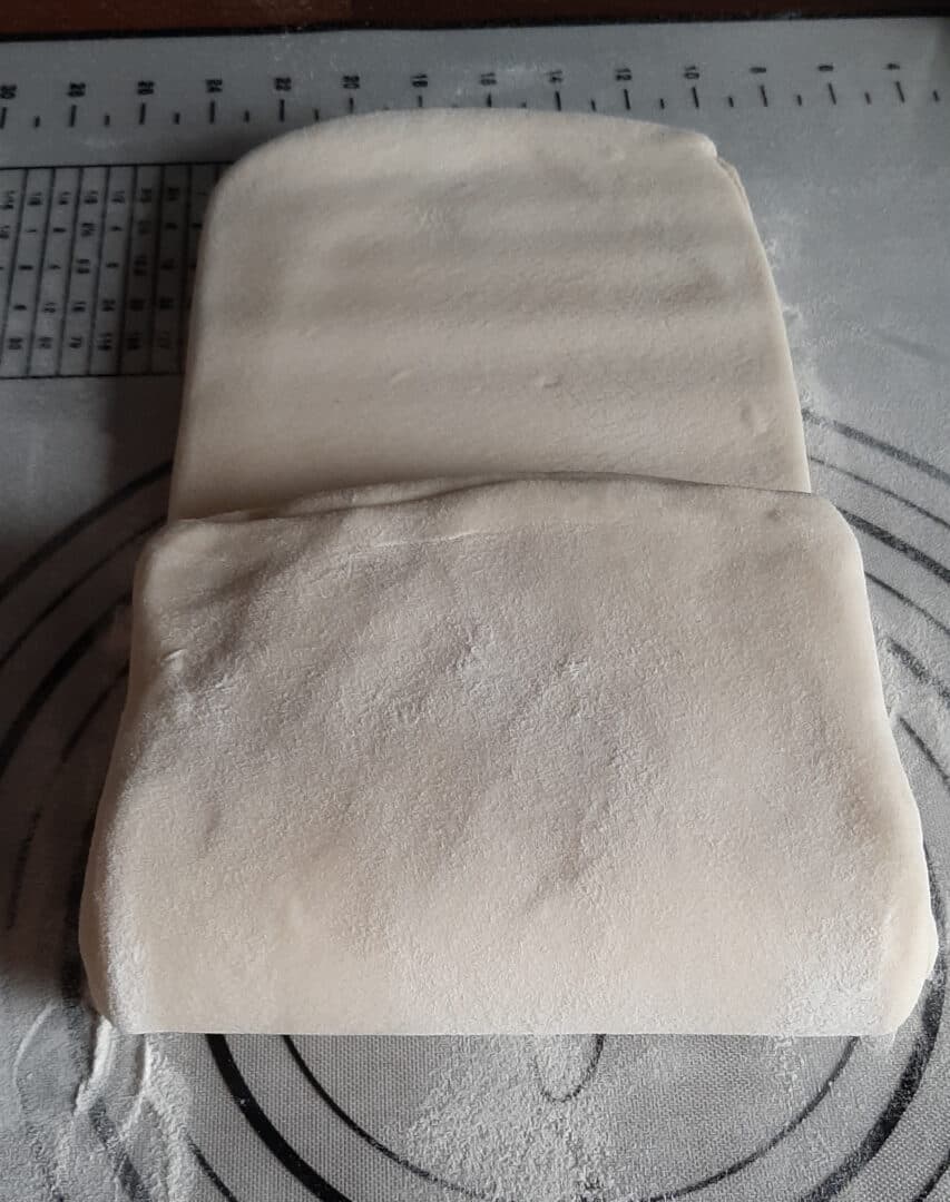 - Enlever le surplus de farine et rabattre la partie de votre côté vers le centre (1/3 de la longueur).
