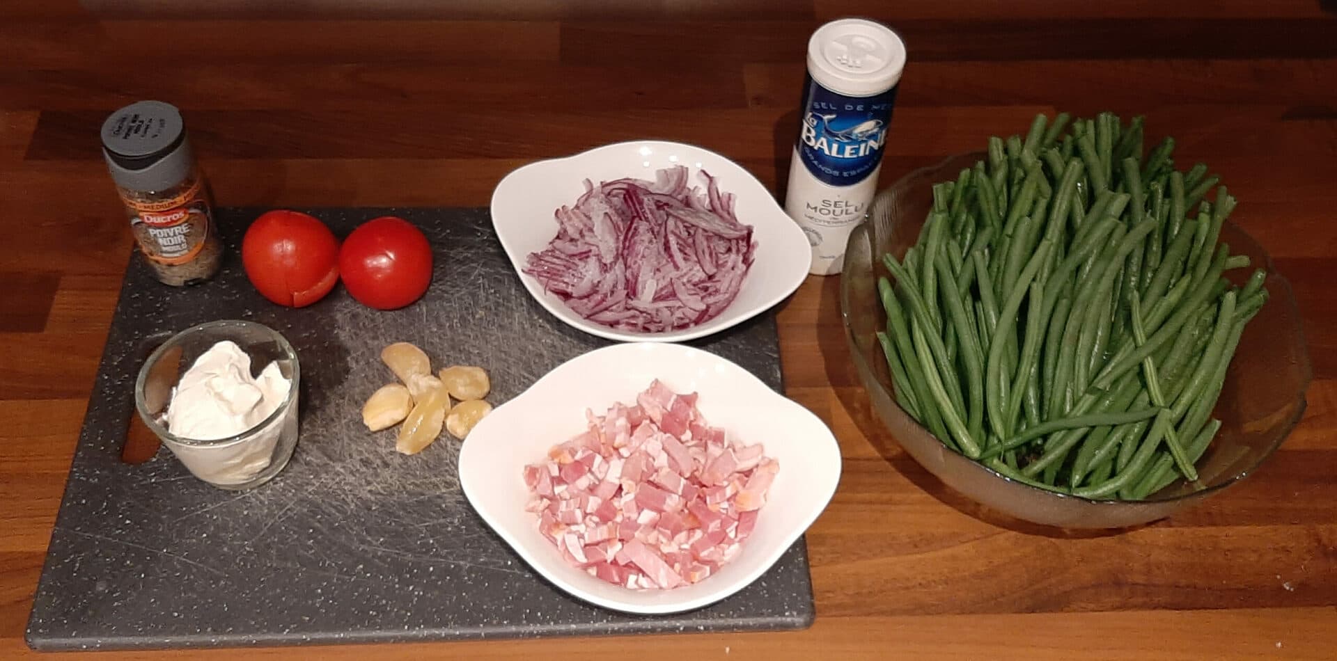- Équeuter les haricots et les laver. Les mettre dans une cocotte-minute avec un fond d'eau et faire chauffer