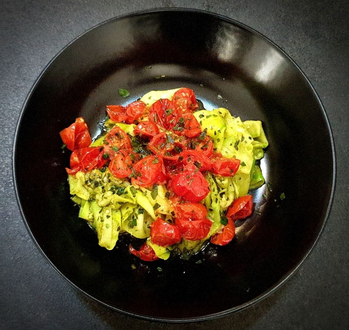 Tagliatelles de courgettes au pesto vert et tomates cerises au four