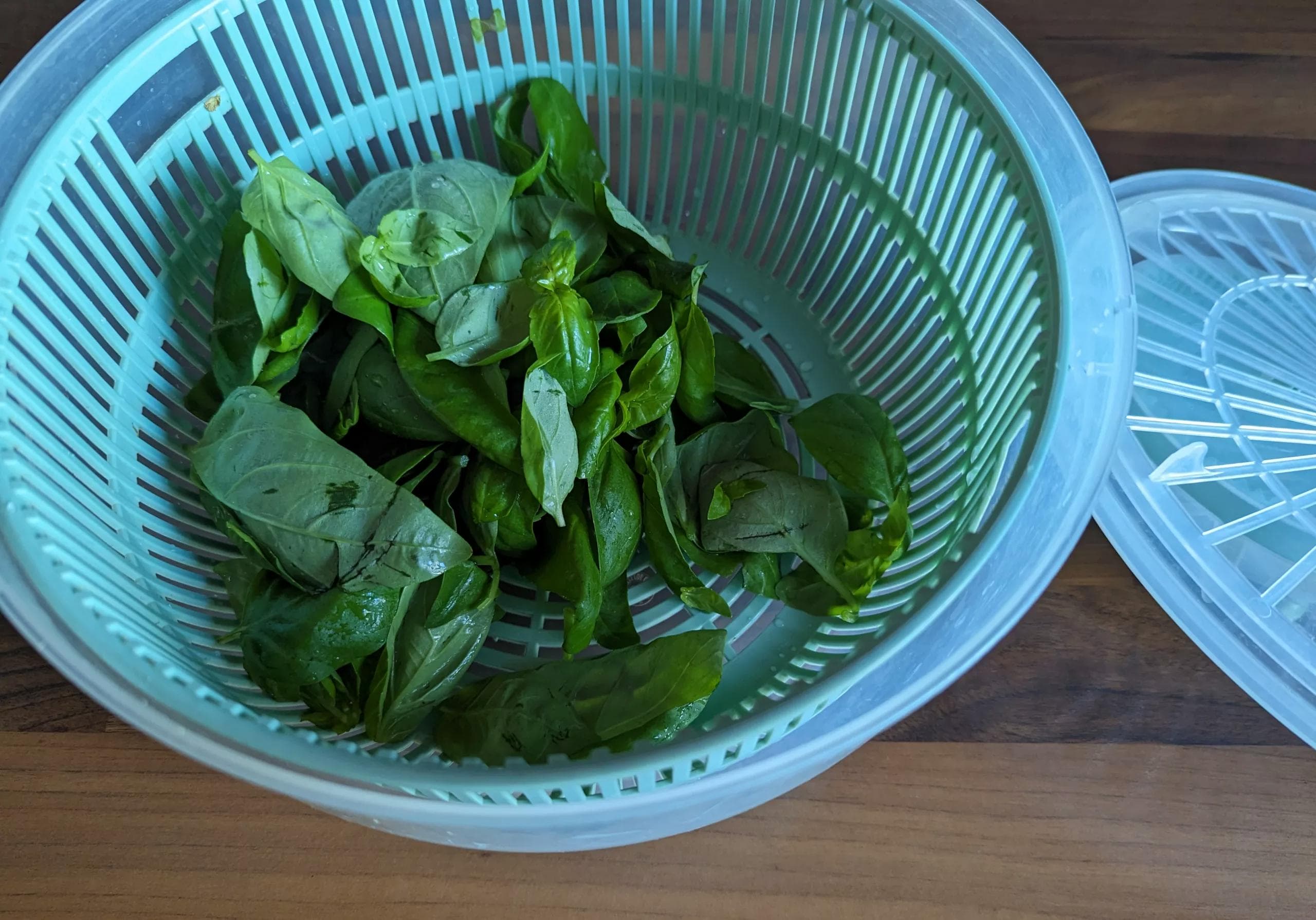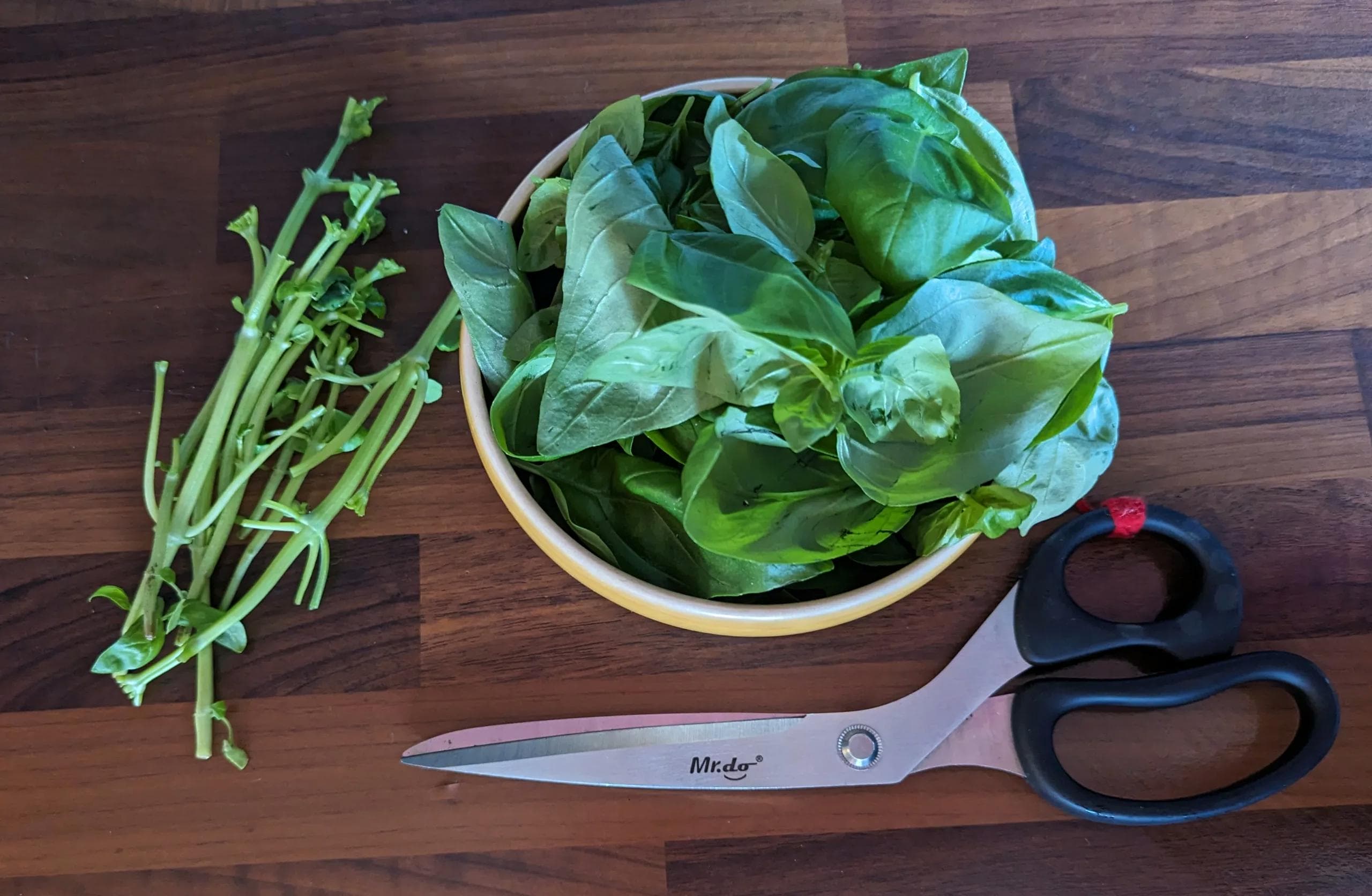 - Ensuite, à l'aide d'un ciseau de cuisine, séparer les tiges des feuilles de basilic. Prélever 20 grammes de feuilles.