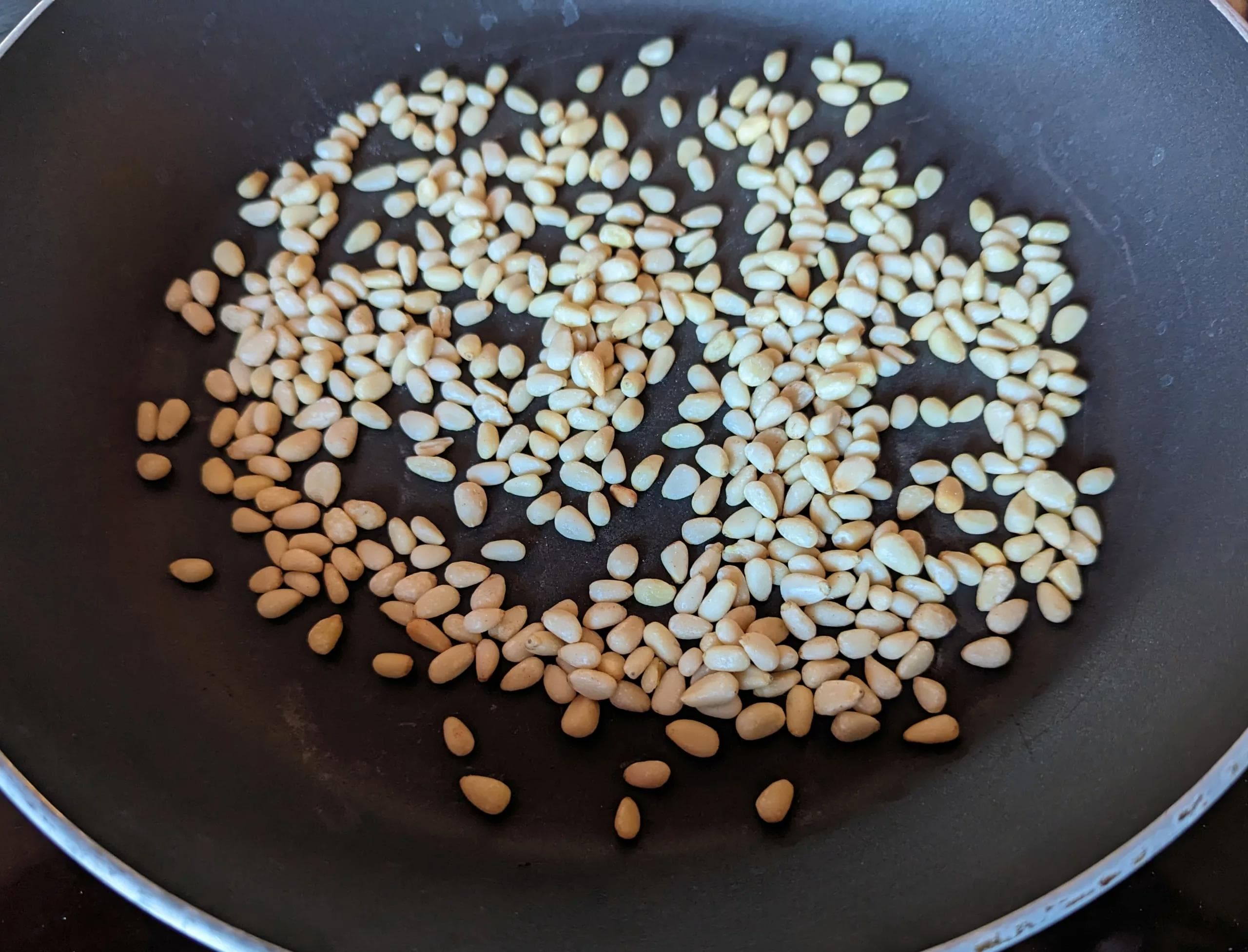 - Torréfier les pignons de pin environ 3 minutes dans une poêle.