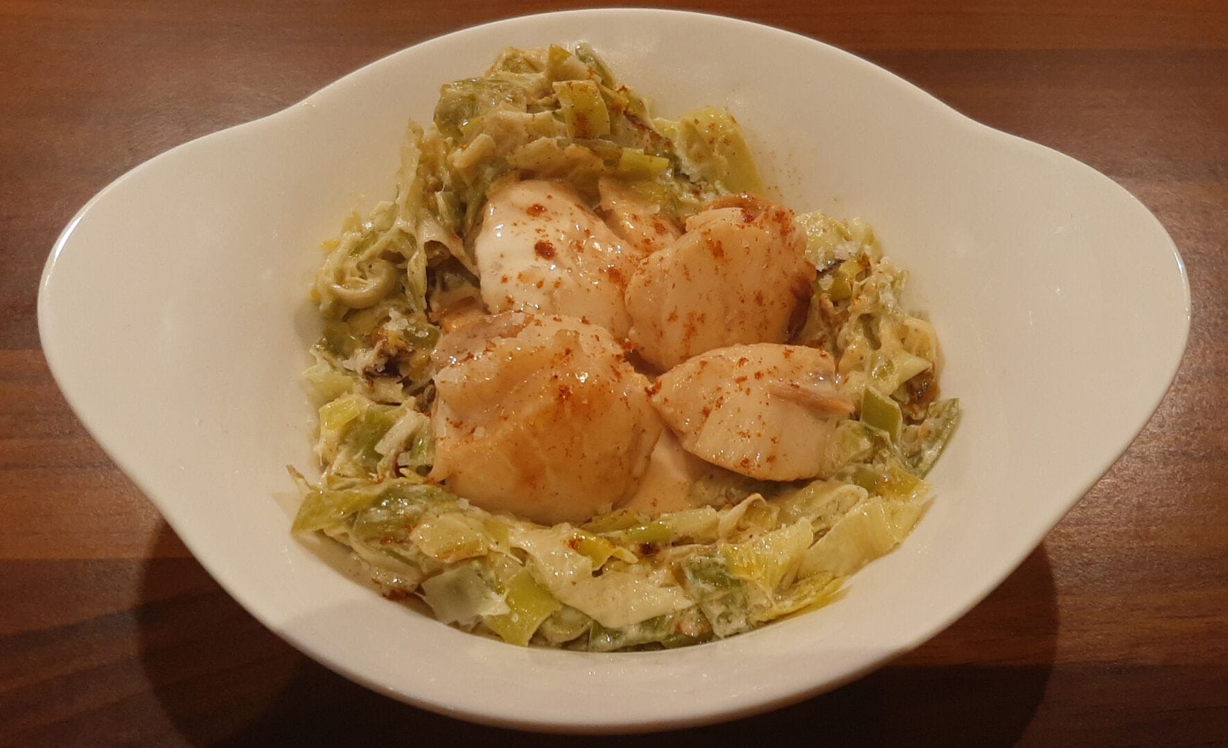 Noix de Saint-Jacques flambées au Calvados sur lit de poireaux