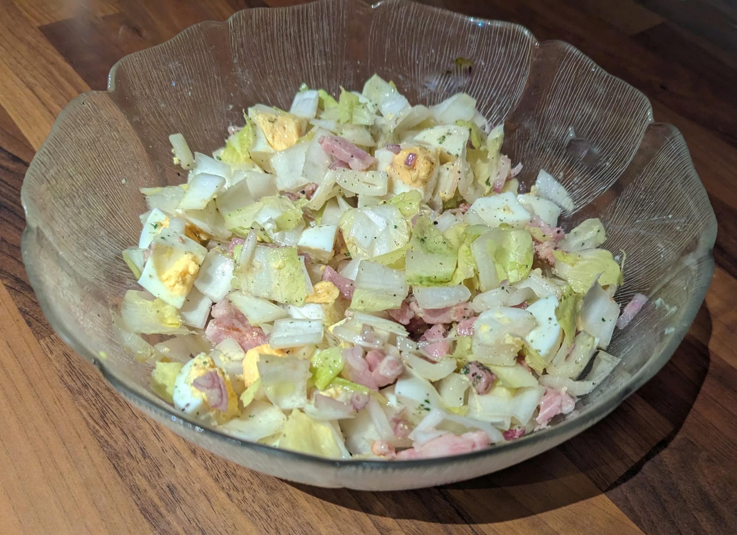 Une délicieuse salade d'endives composée, agrémentée de lardons croustillants et d'œufs durs savoureux. Une recette simple et rapide mais gastronomique.Une combinaison parfaite de croquant et de tendresse, rehaussée par une vinaigrette maison.C'est un régal pour les papilles avec cette salade classique qui ne se démode jamais.
