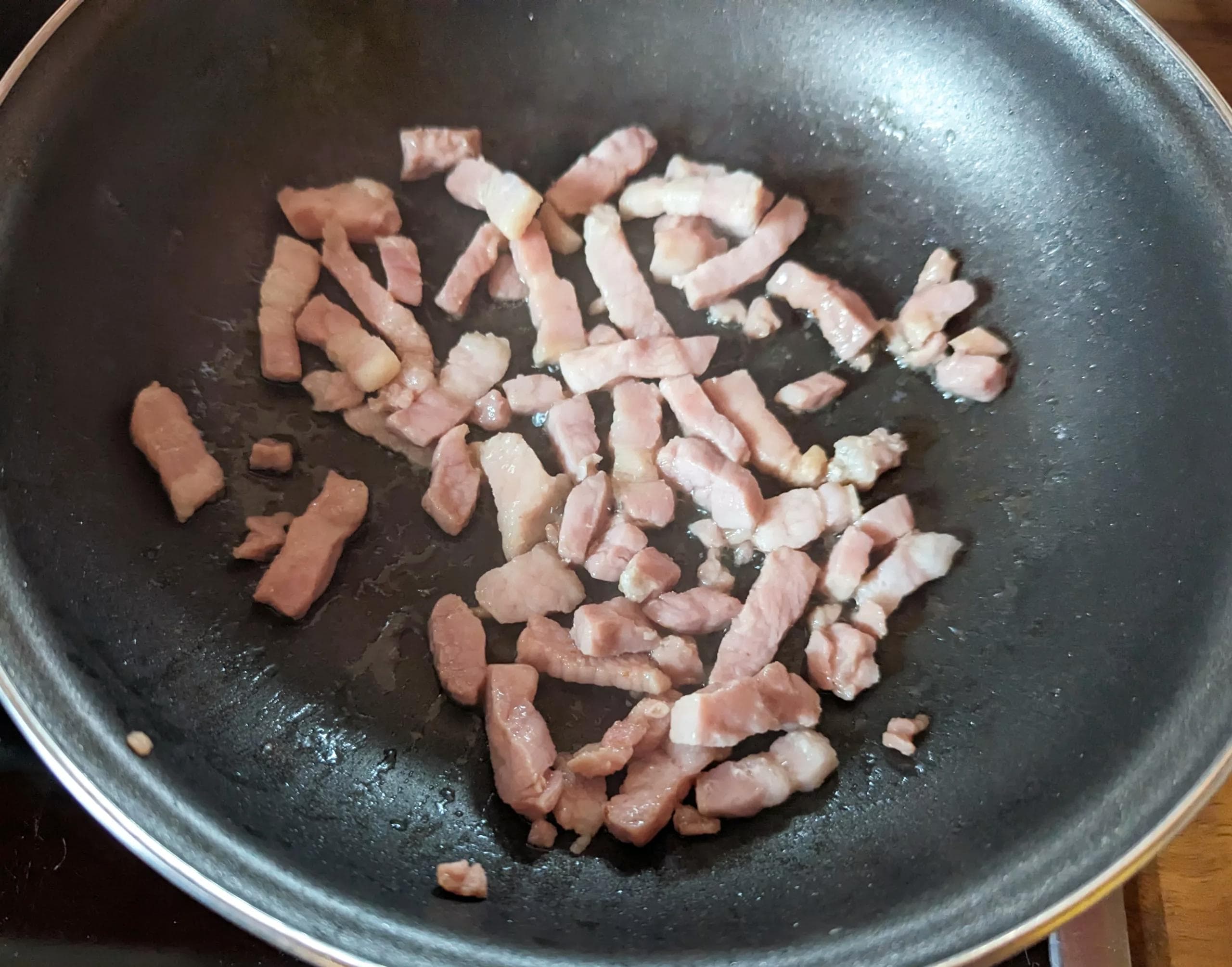 - Pendant ce temps, faire chauffer les lardons fumés dans une poêle.