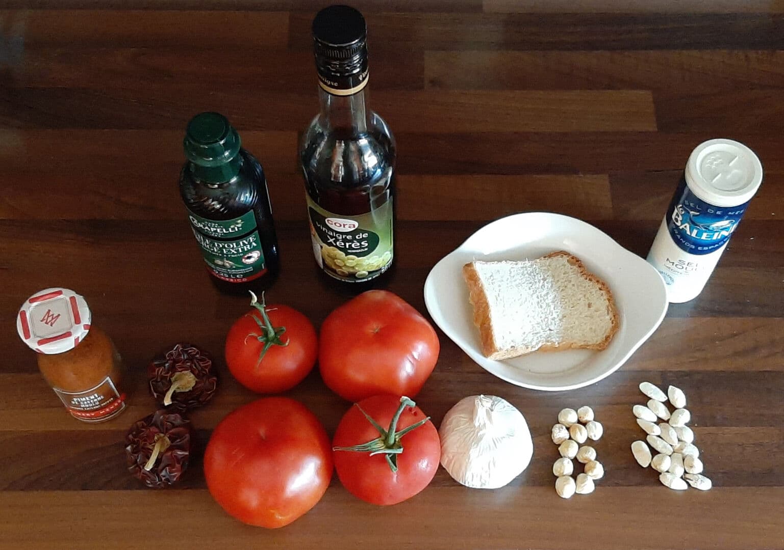 - Dans un saladier, mettre les tomates, la chair de poivron nora, 5 gousses d'ail, les amandes, les noisettes, le pain de mie, l'huile d'olive, le vinaigre, le sel et le piment doux.
