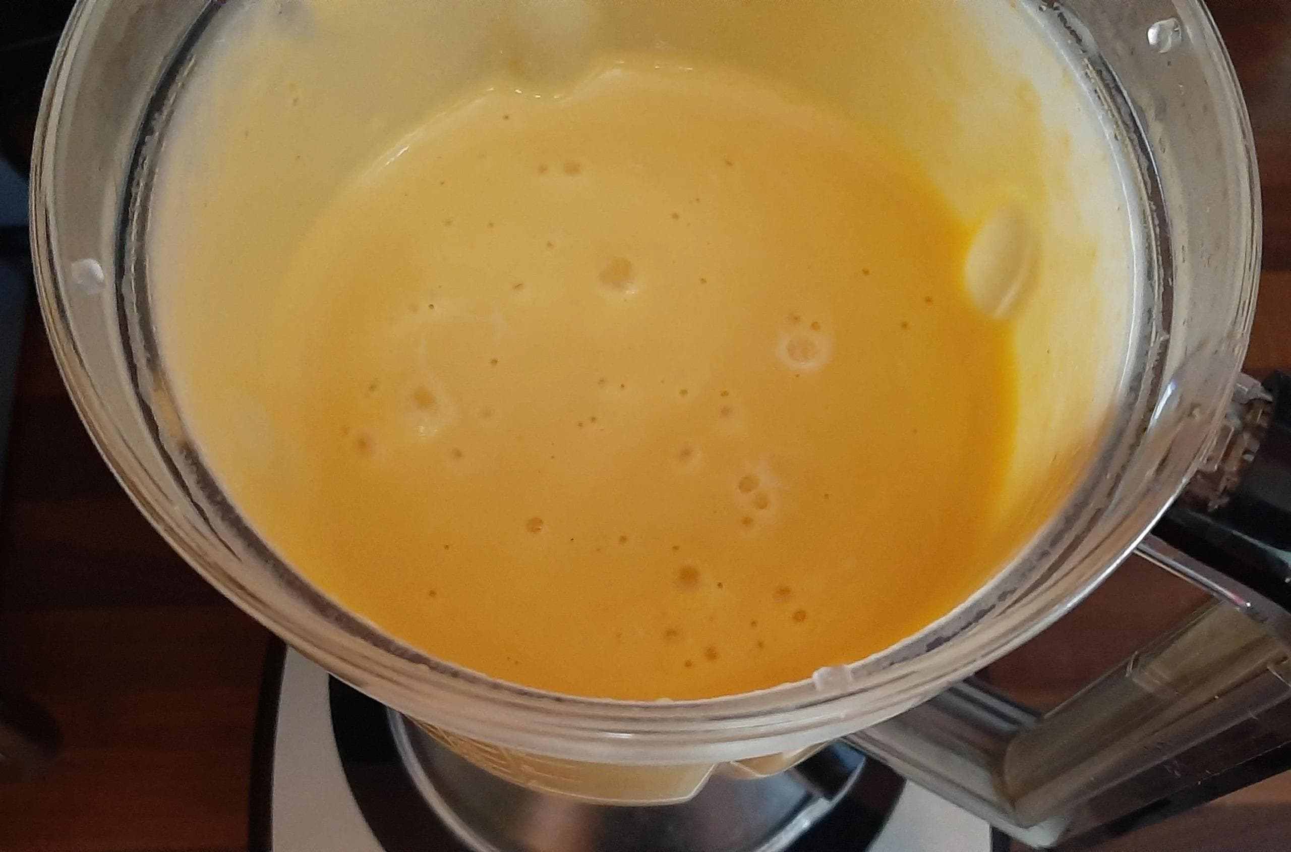 - Dans un blender, mettre la crème fraiche épaisse, le lait, le contenu du chinois, le sel et le poivre.