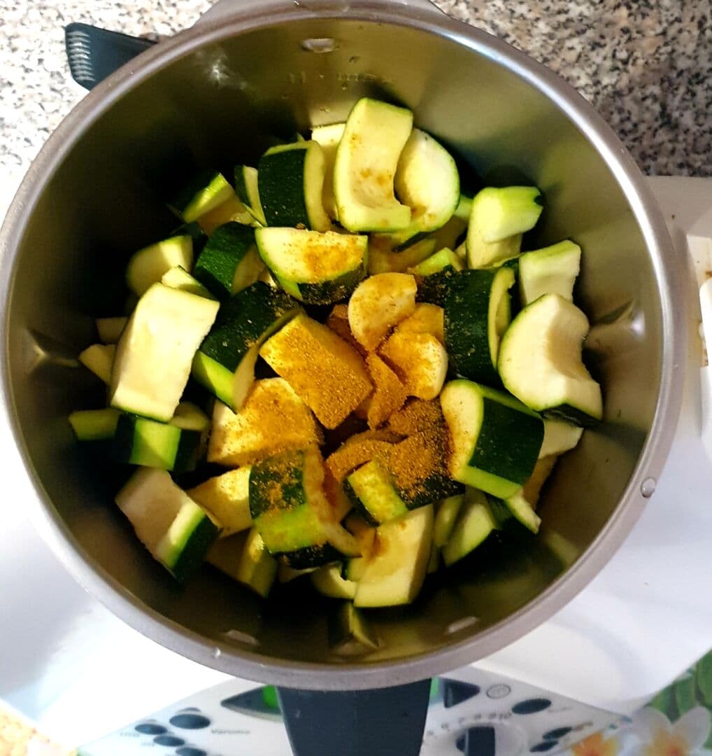 - Dans le bol du Thermomix, ajouter l'oignon et les morceaux de courgettes.