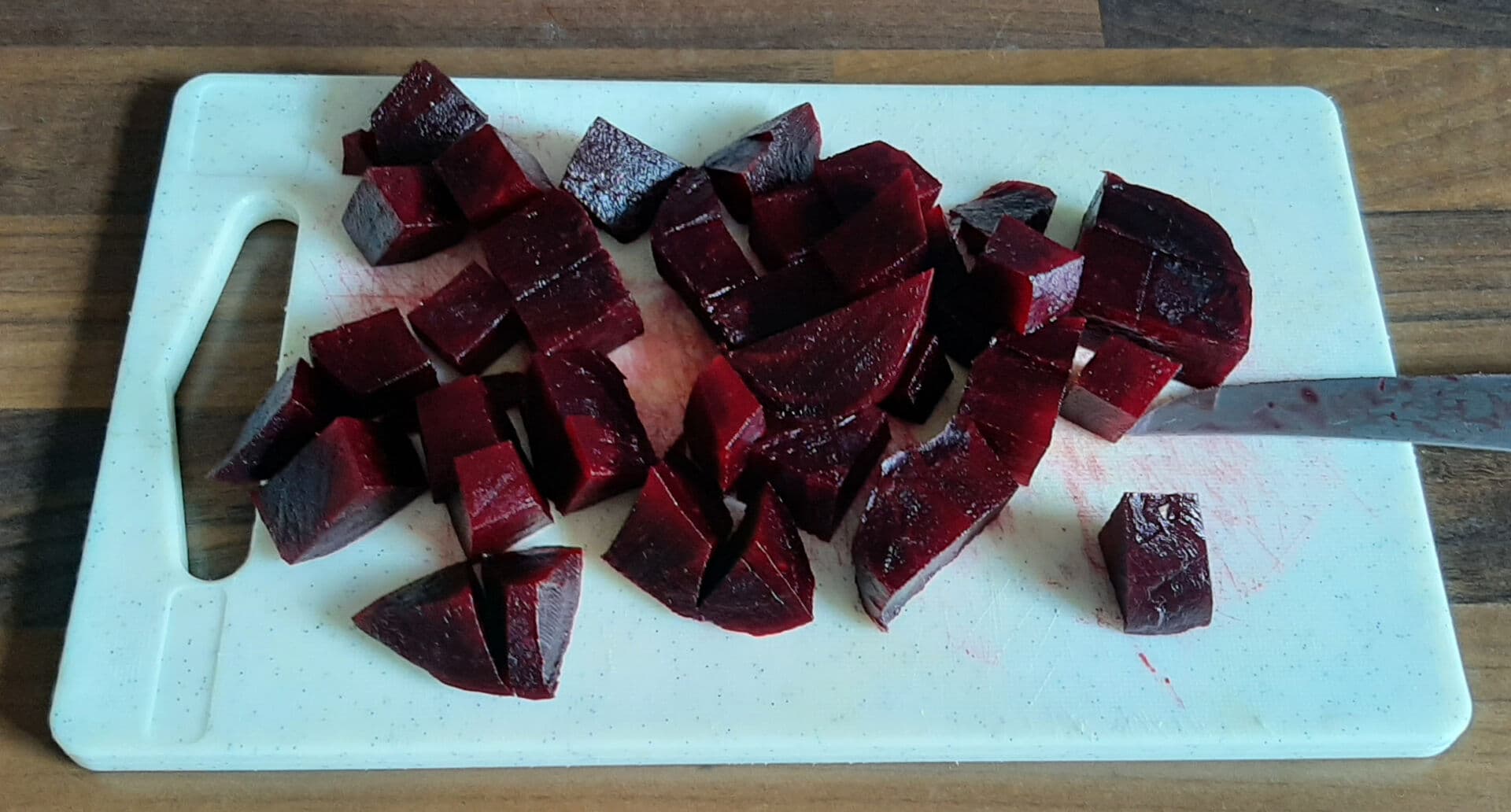 - Commencer par cuire les betteraves rouges à la cocotte minute et les éplucher.