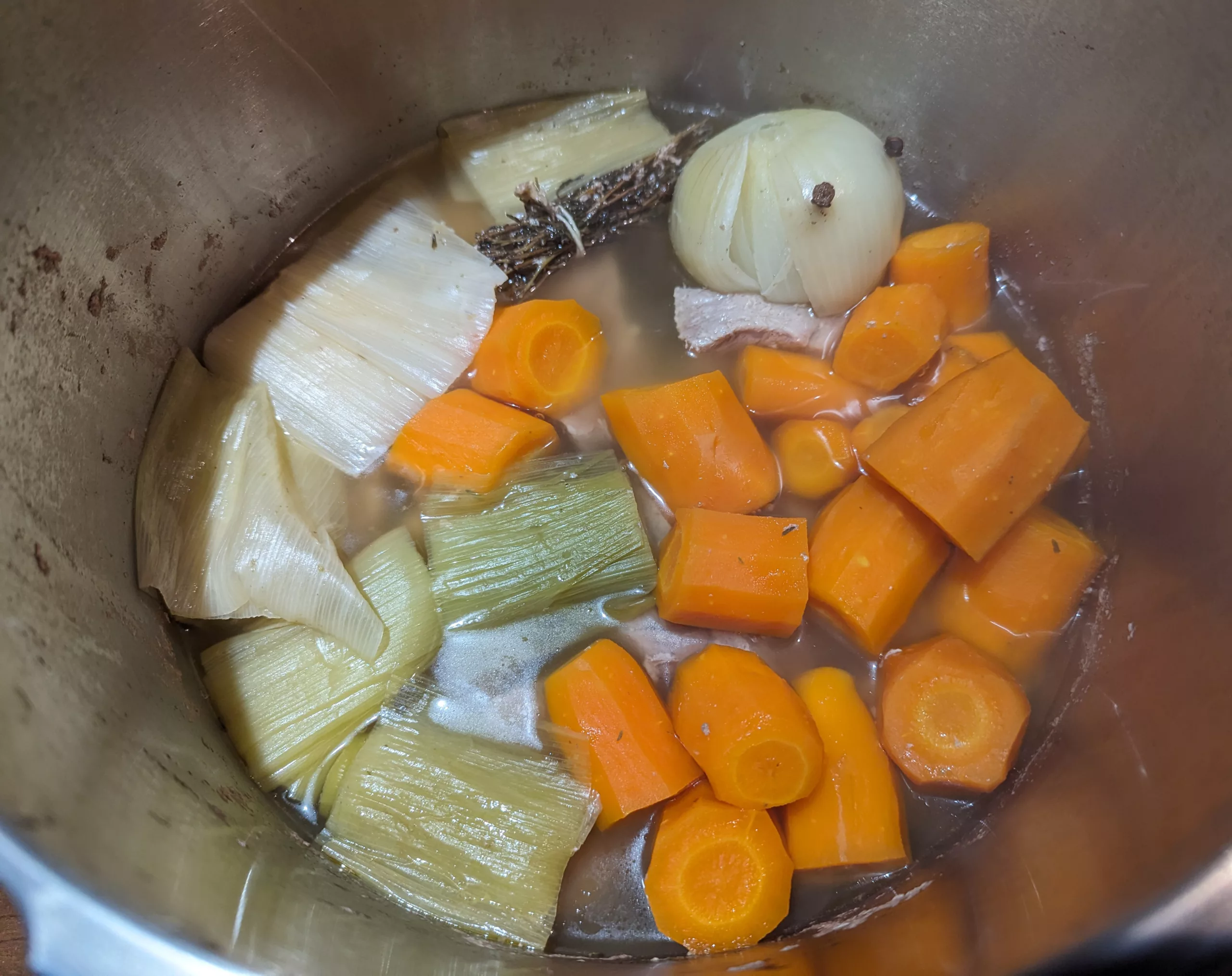 Puis, rajouter les carottes et le poireau coupés. Compléter avec le bouquet garni, les cubes de bouillon de volaille et l'oignon jaune piqué des clous de girofle.