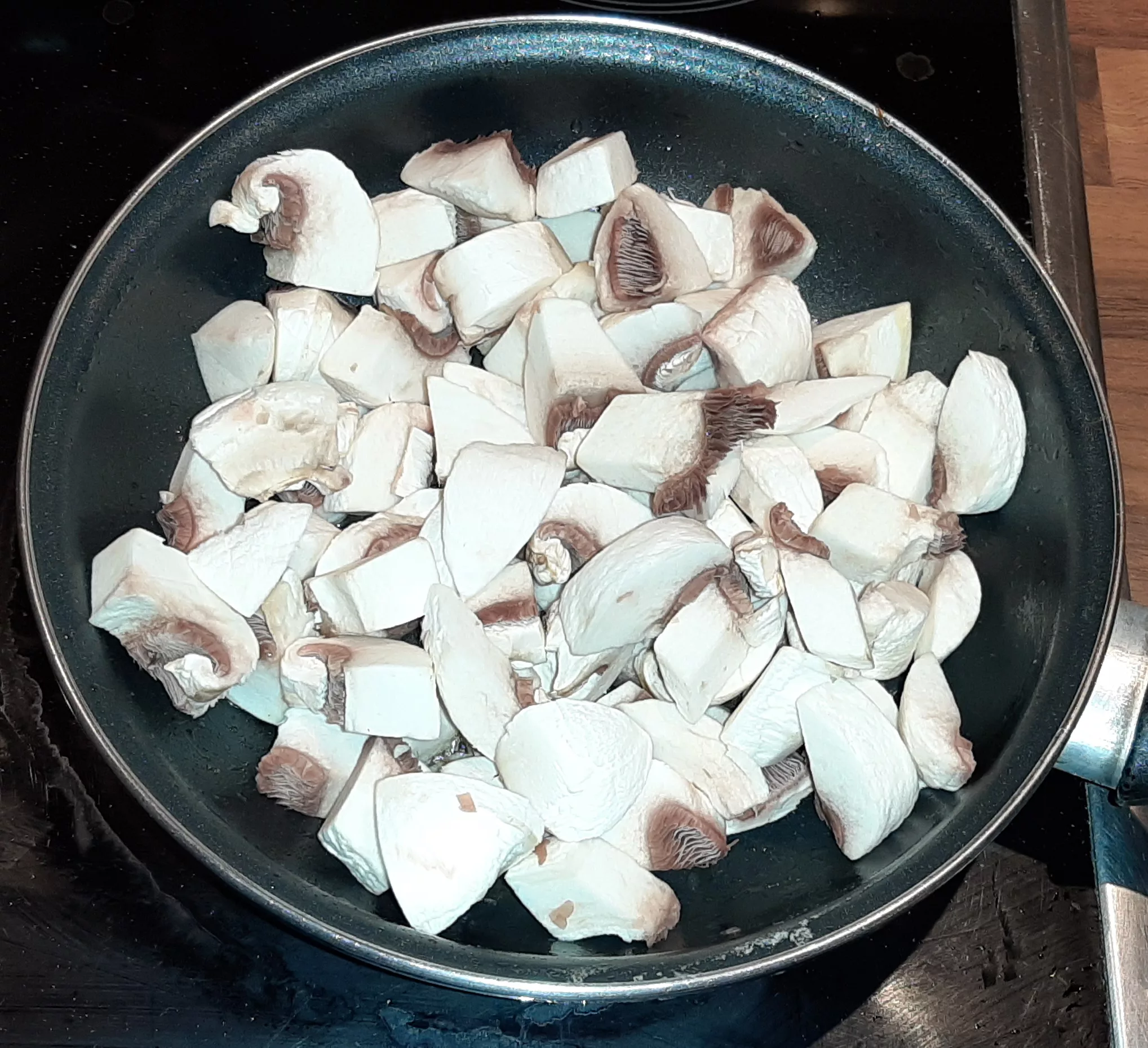 Faire fondre 20 grammes de beure dans une poêle, y mettre les champignons et les faire dorer.