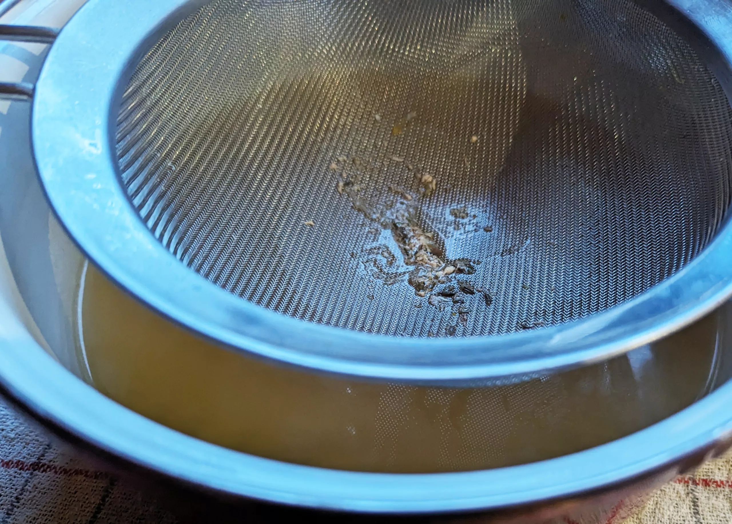 Ensuite, dépressuriser l'autocuiseur et l'ouvrir. Séparer le bouillon du reste avec une passoire. Enlever le bouquet garni, l'oignon et les clous de girofle.