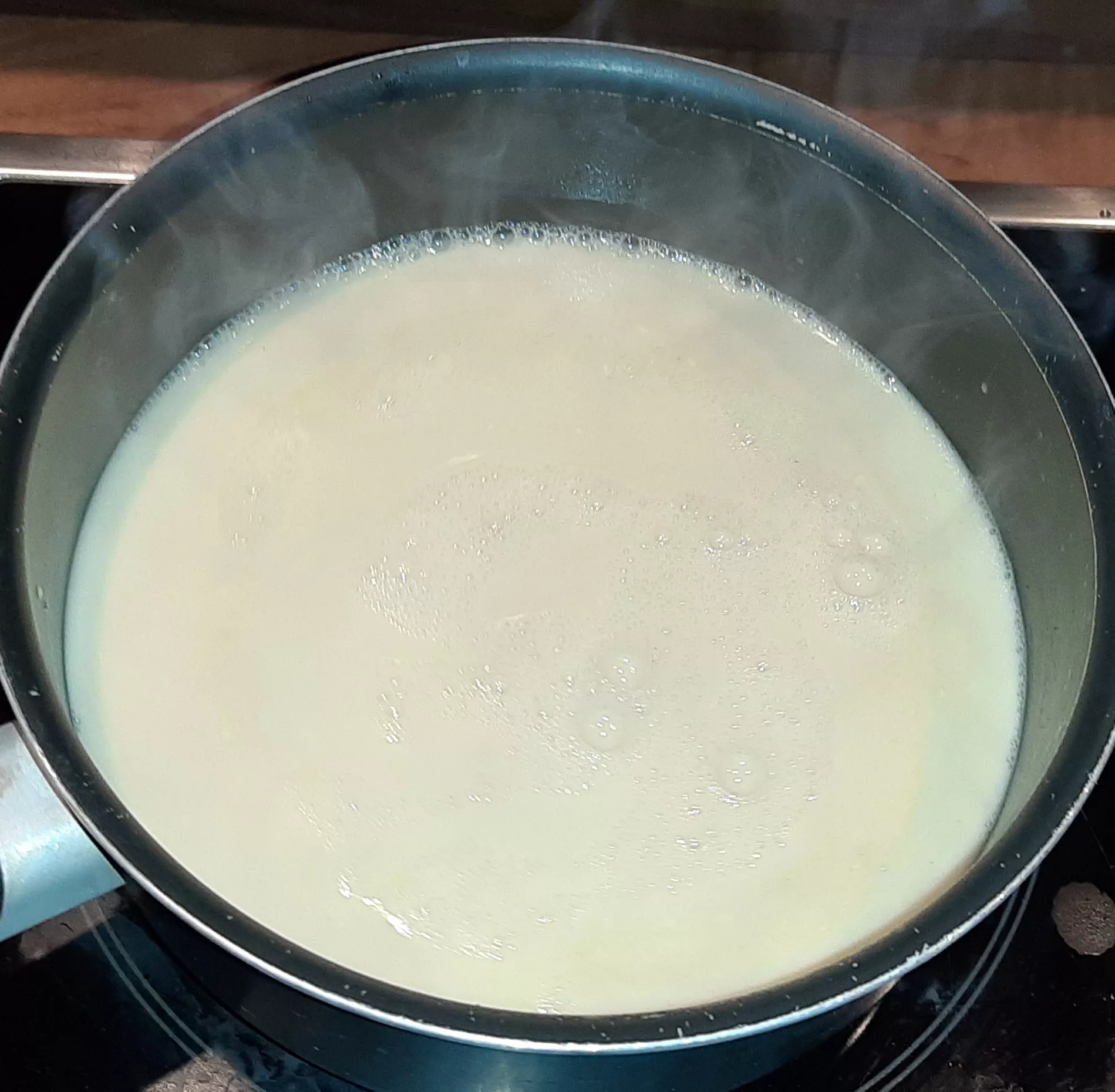 Mettre le bouillon dans une casserole avec 100 grammes de crème fraîche.