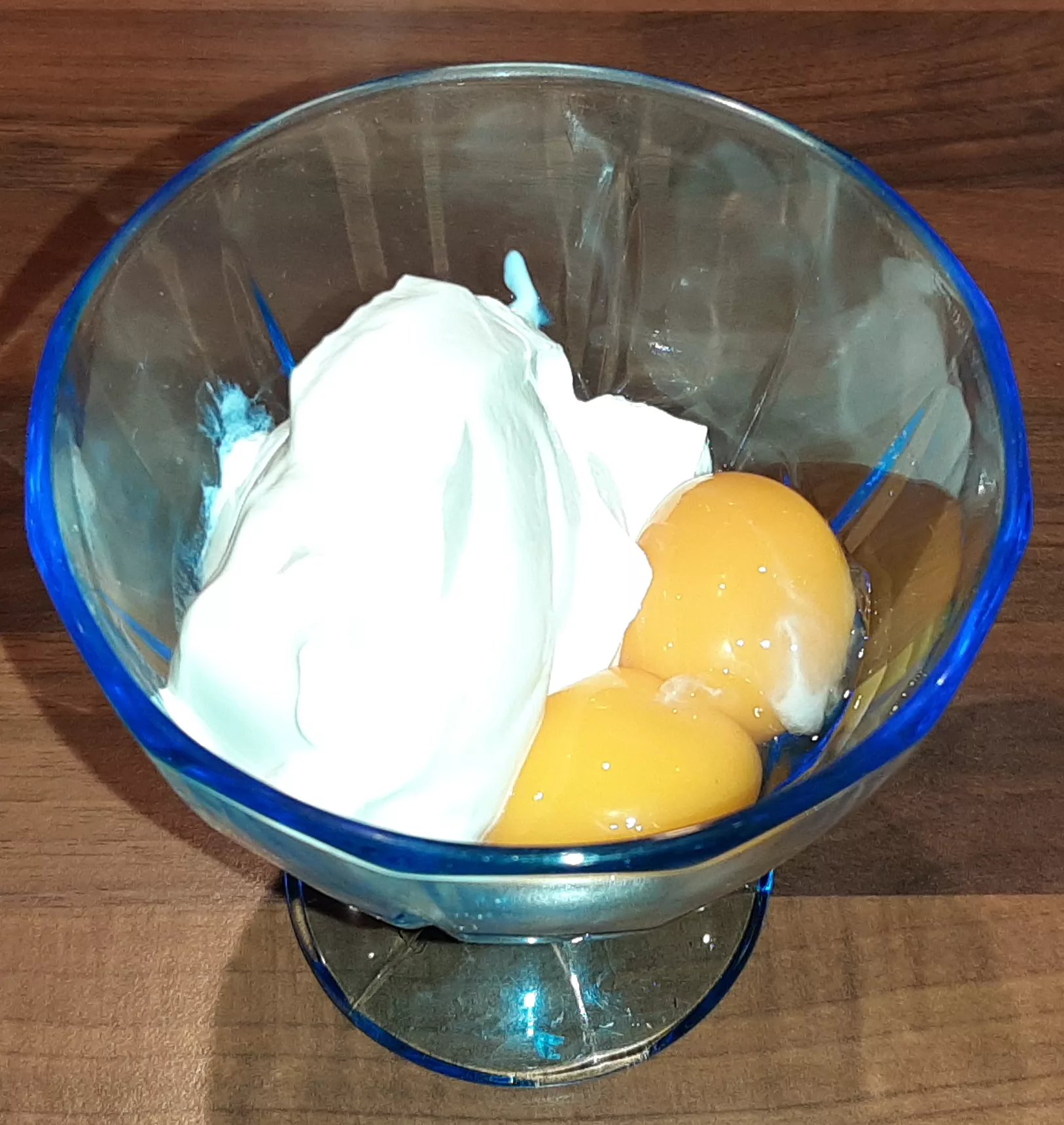 Ensuite, mettre les deux jaunes d'œuf avec 100 grammes de crème fraîche (bien froide) et mélanger.