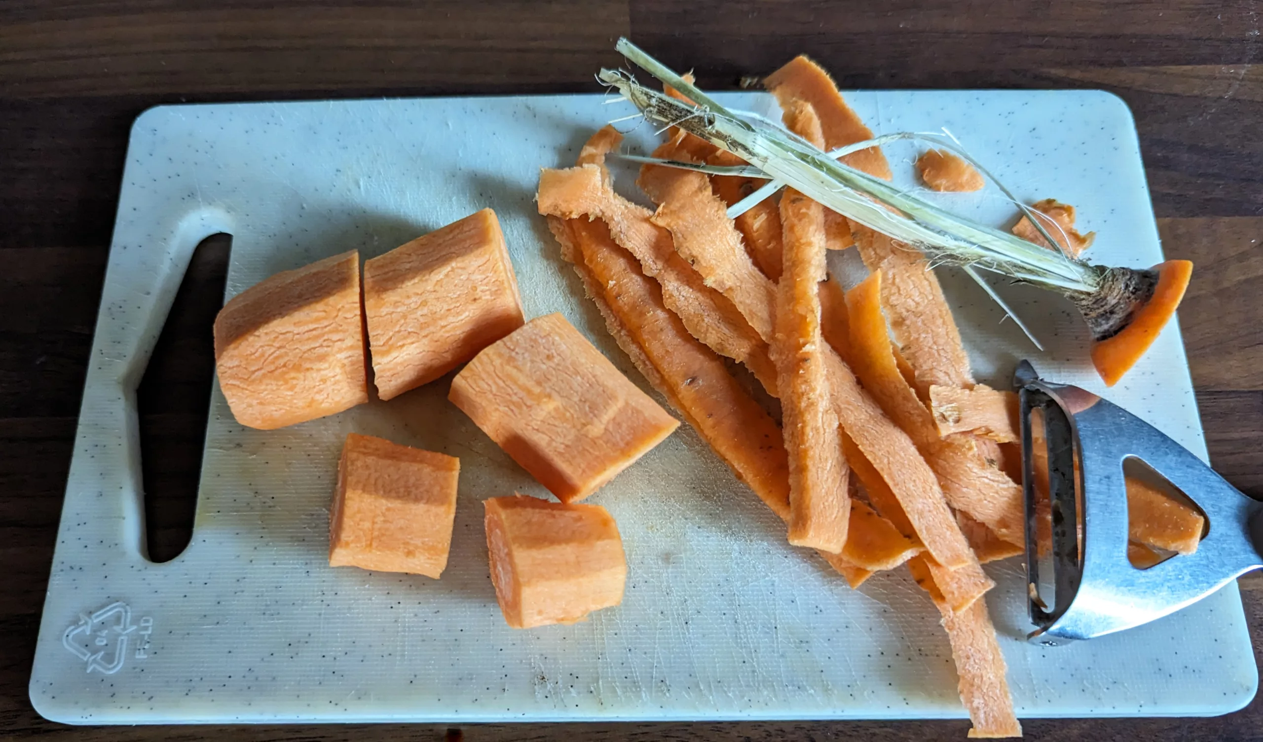 Ensuite, laver les carottes et les éplucher avec un économe. Les trancher en gros morceaux.