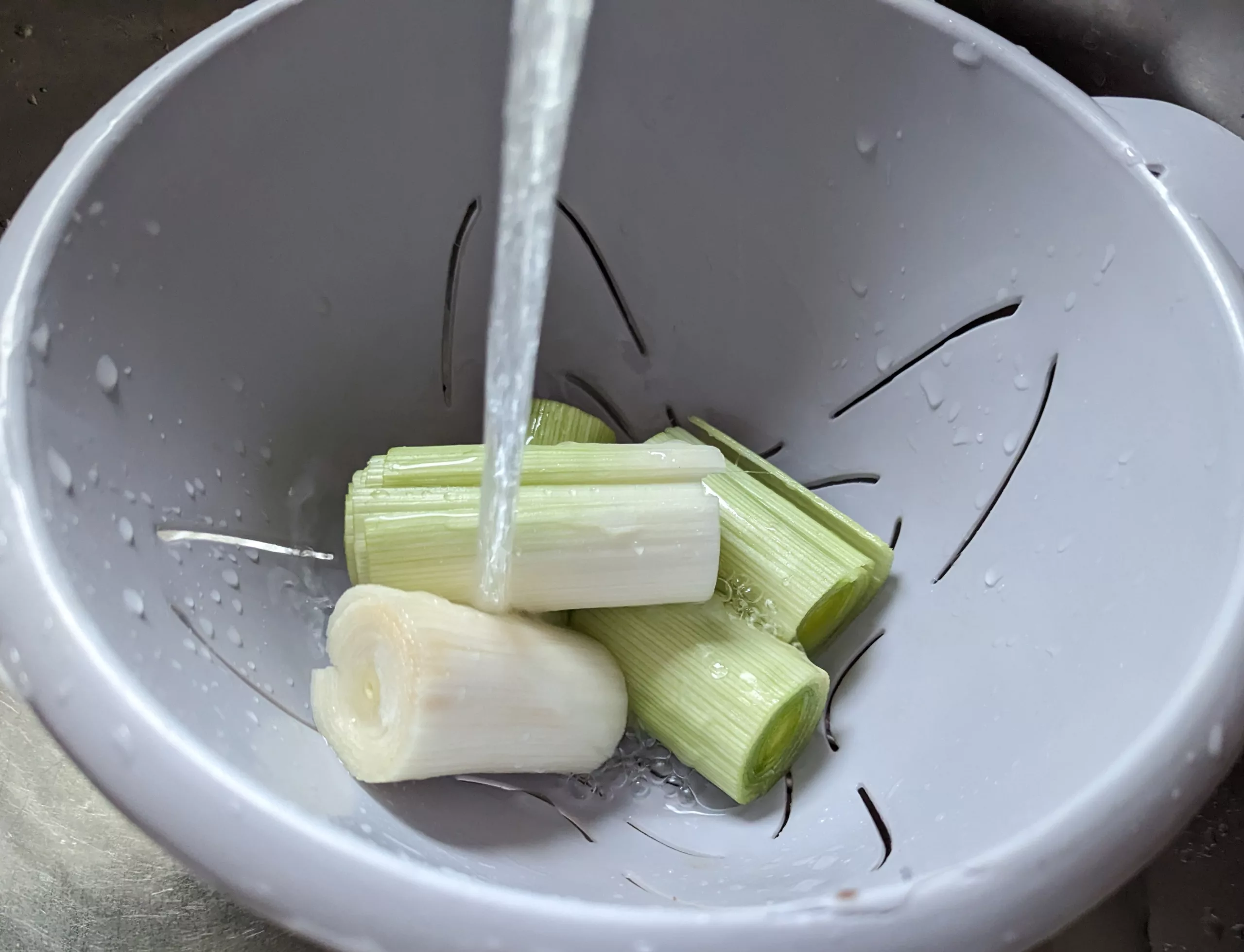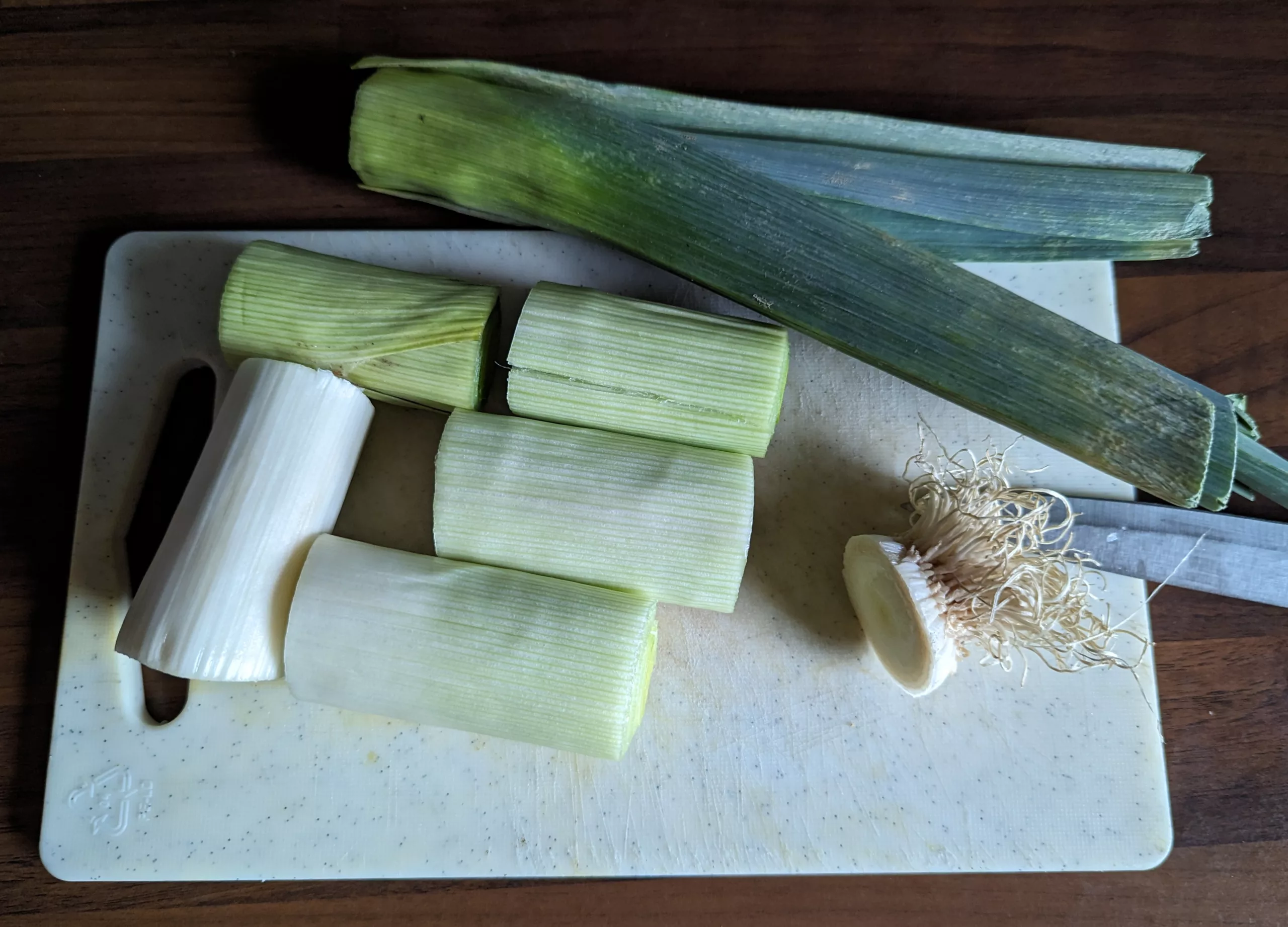 Puis, séparer le blanc de poireau du vert. Ne garder que le blanc et le couper en gros morceaux. Vous pouvez utiliser la partie verte pour faire un bon velouté. Bien le laver pour enlever toute la terre et le sable.