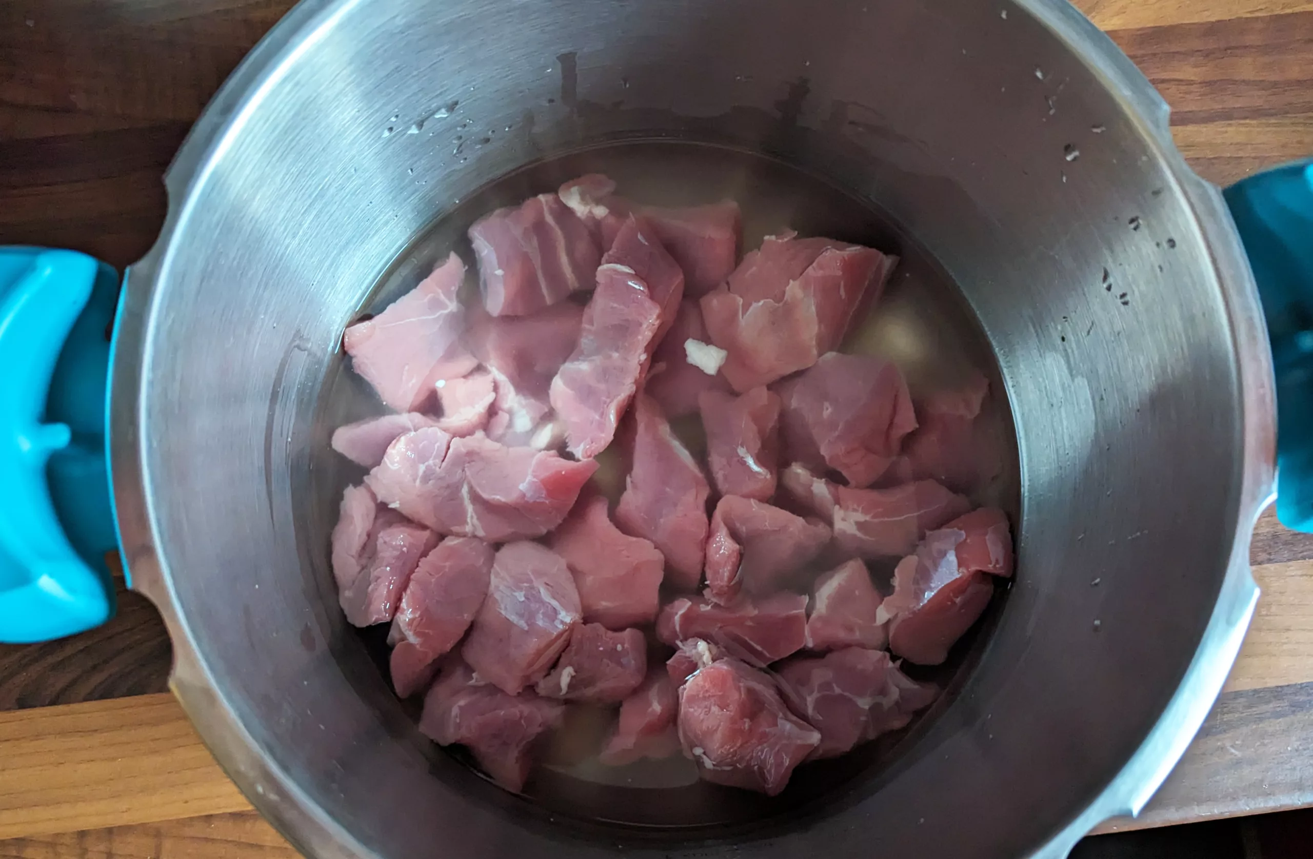 Faire cuire la viande 5 minutes puis enlever l'écume qui se trouve en surface. Cela enlèvera le goût amère de votre viande et évitera aussi de boucher la soupape de votre cocotte minute.