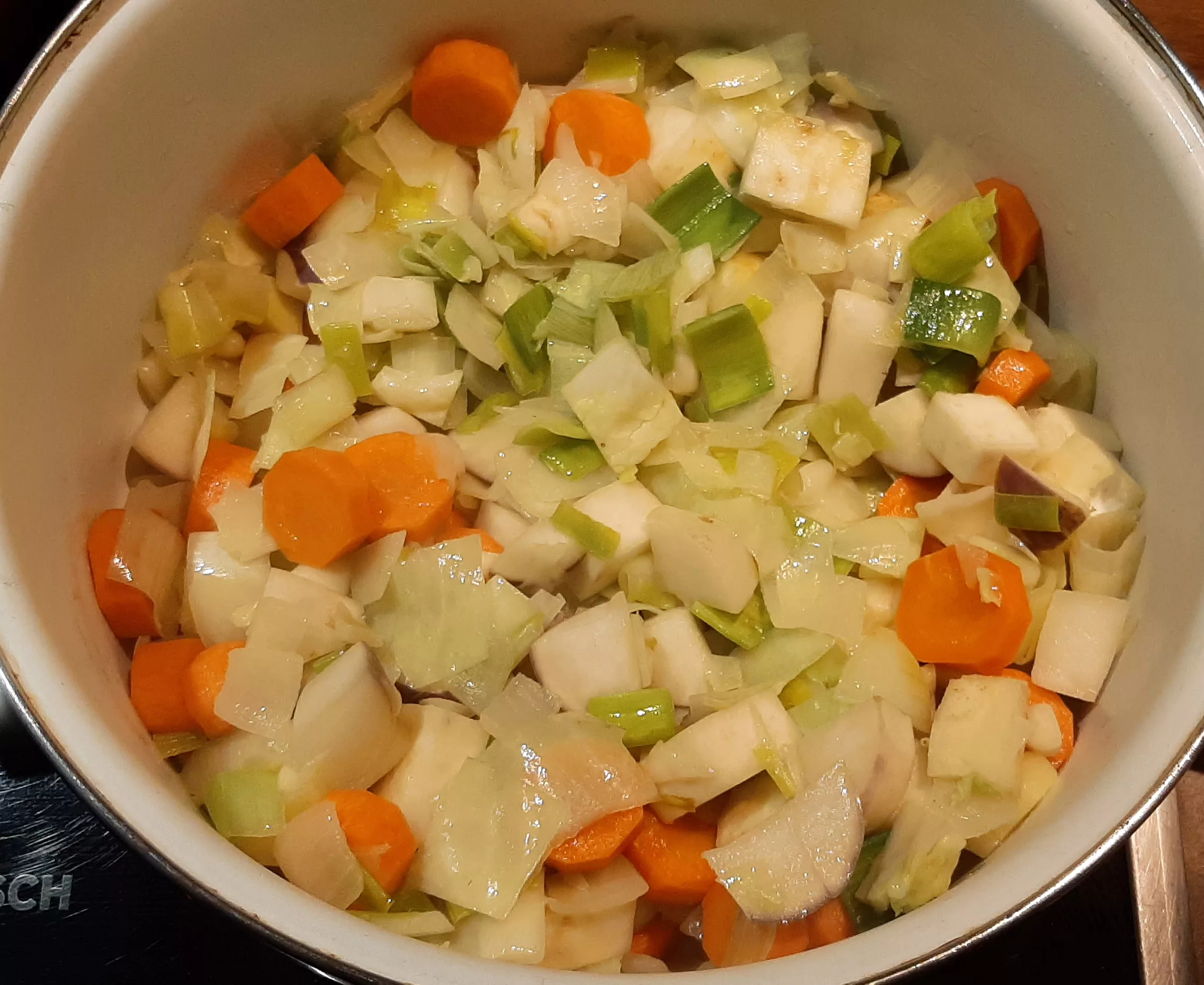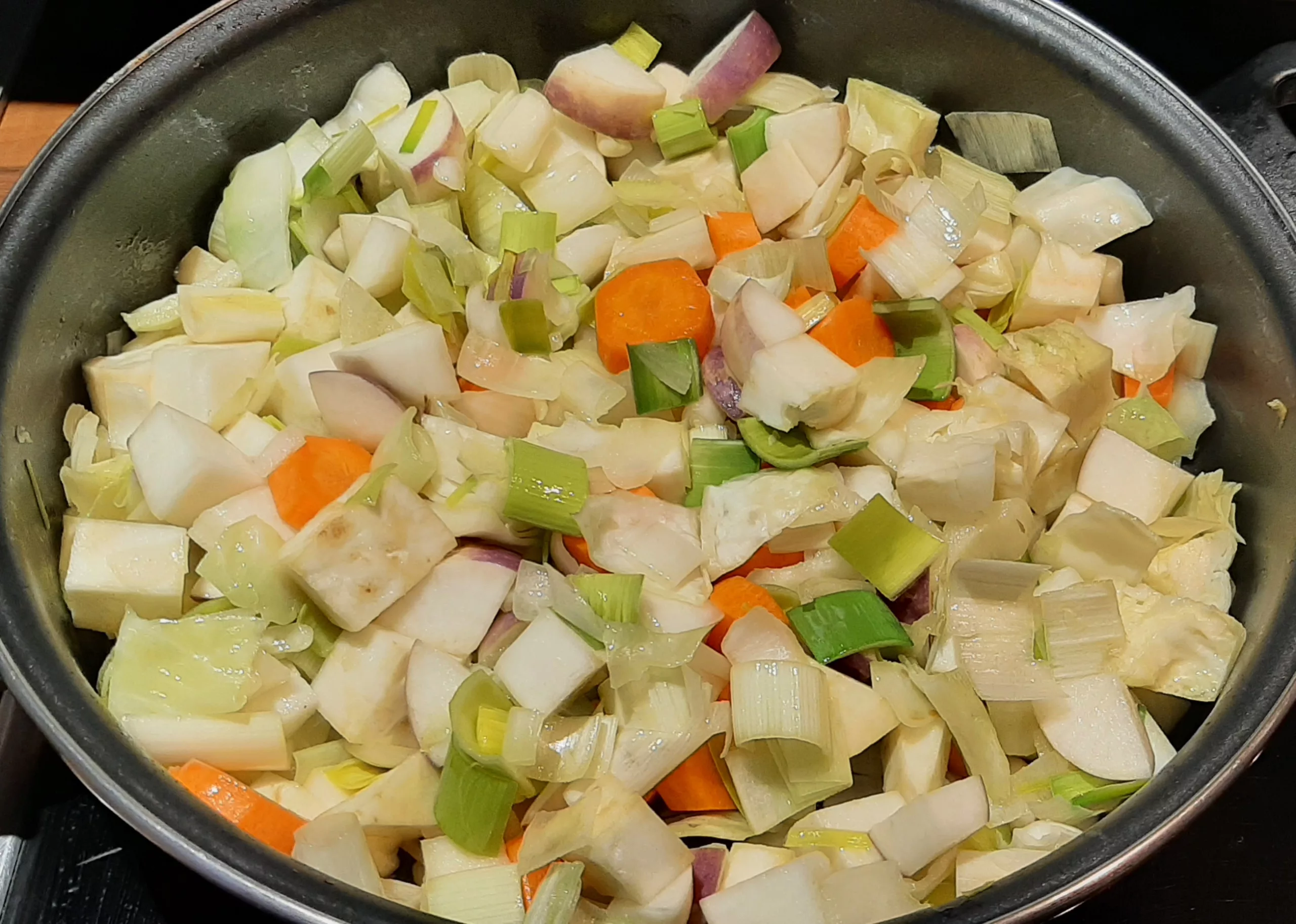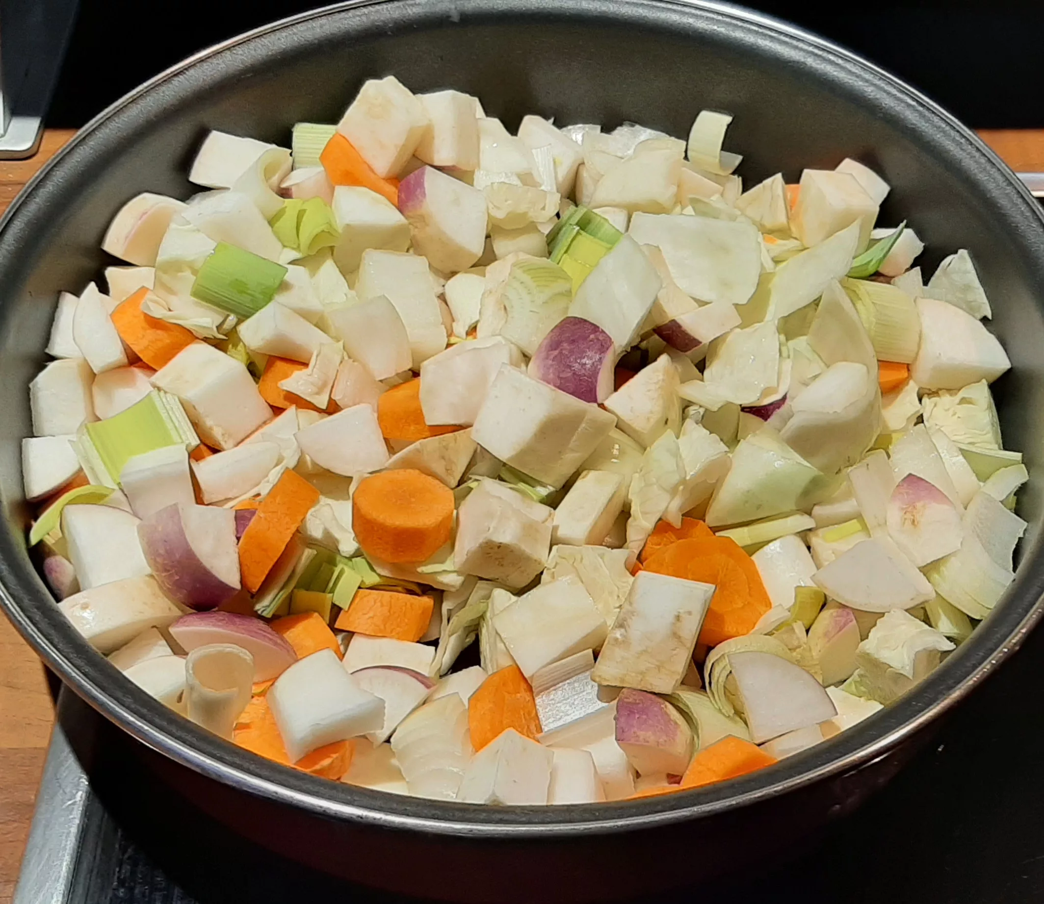 Puis, mettre les morceaux de navets, de carottes, de céleri-rave, de chou, d'oignons et de poireau.