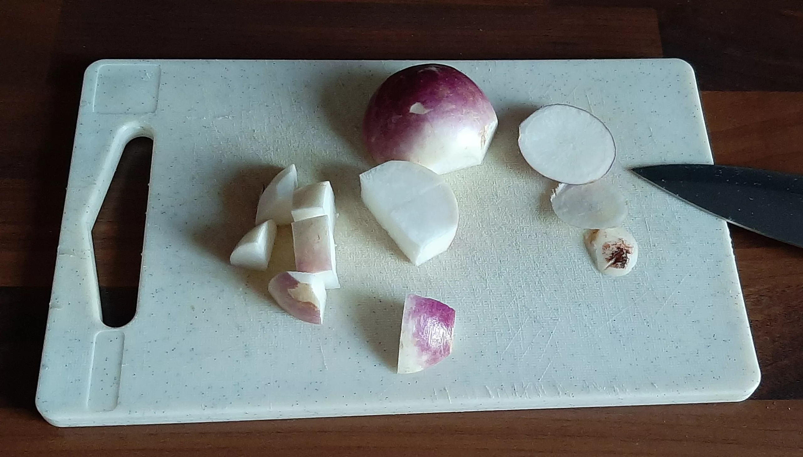 Commencer par laver tous les légumes. Enlever les extrémités des navets et les couper en gros morceaux.