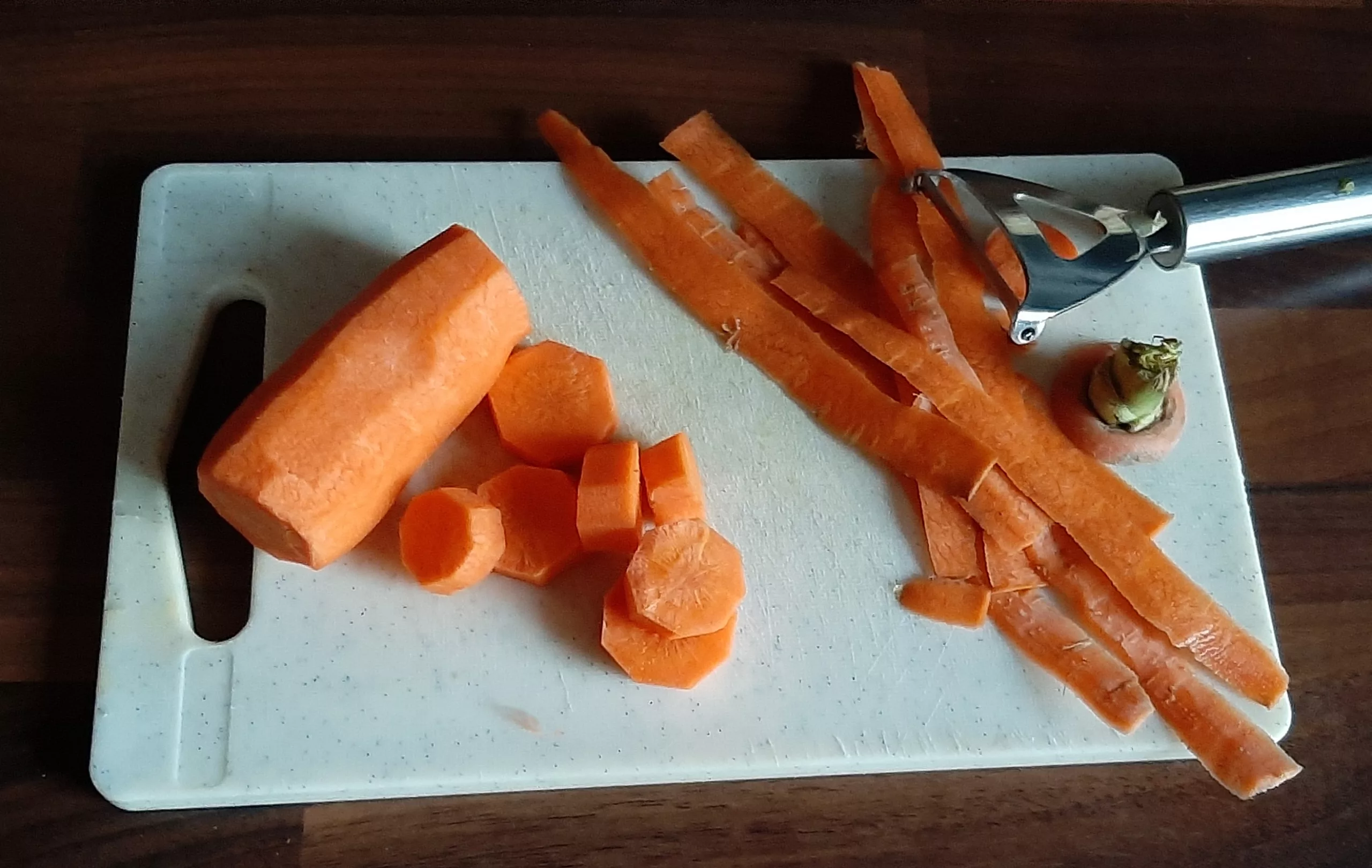 Ensuite, éplucher les carottes avec un économe et les couper en morceaux.
