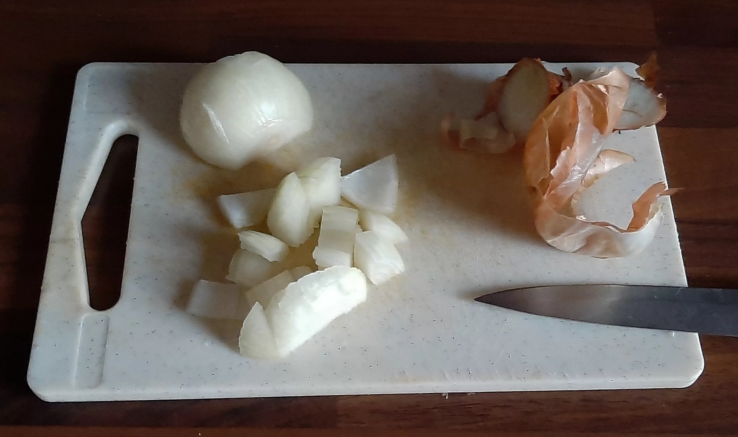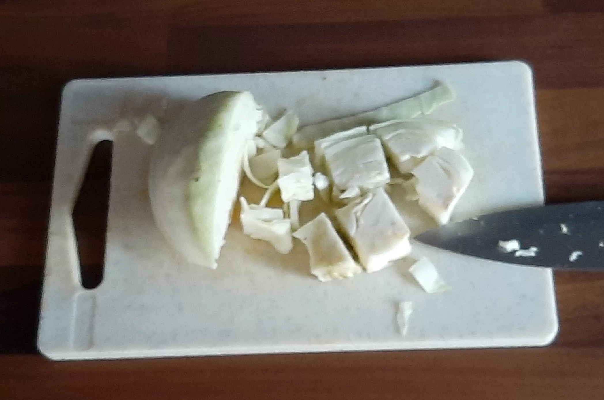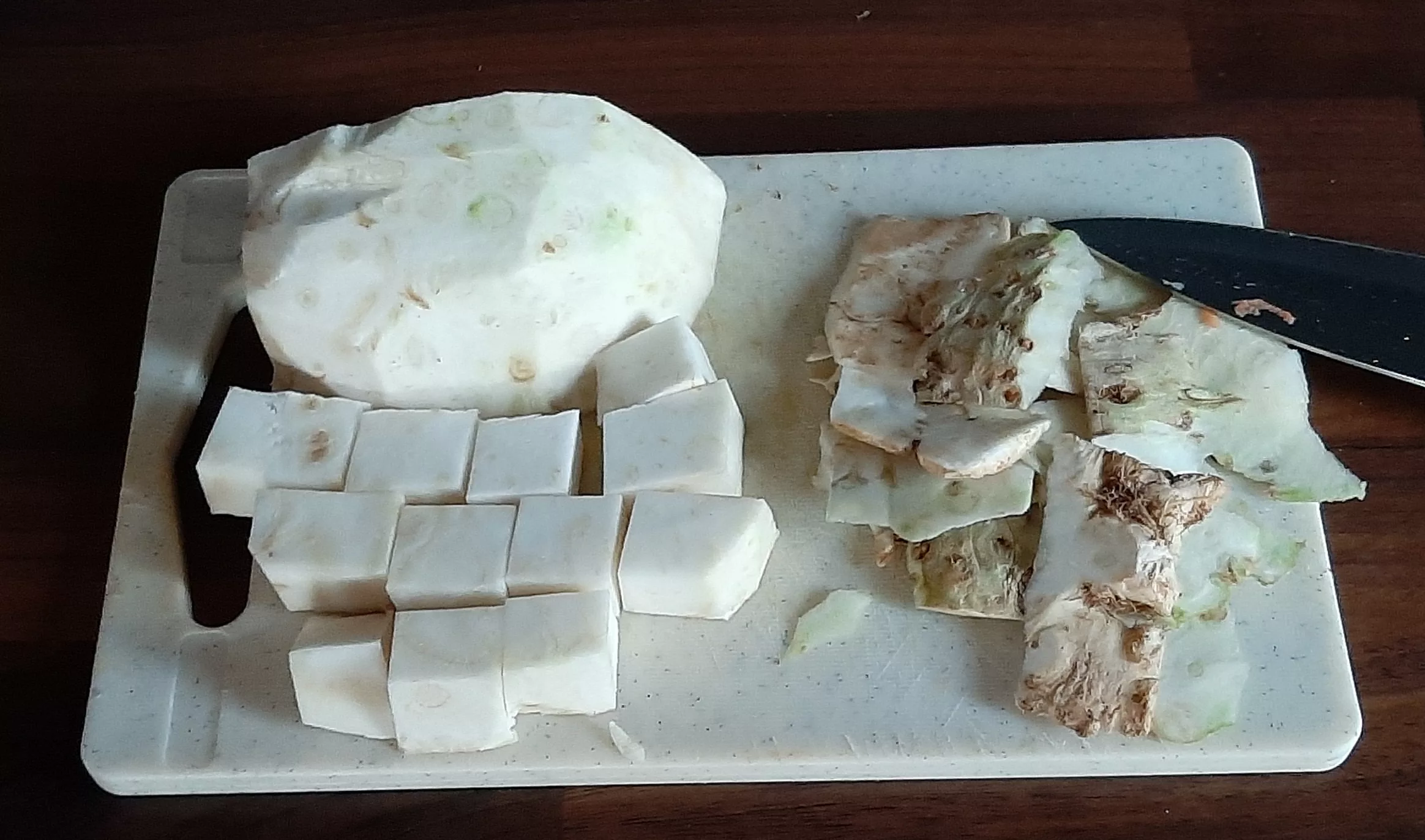 Puis, ôter la peau du céleri-rave avec un bon couteau de cuisine et le couper en morceaux.