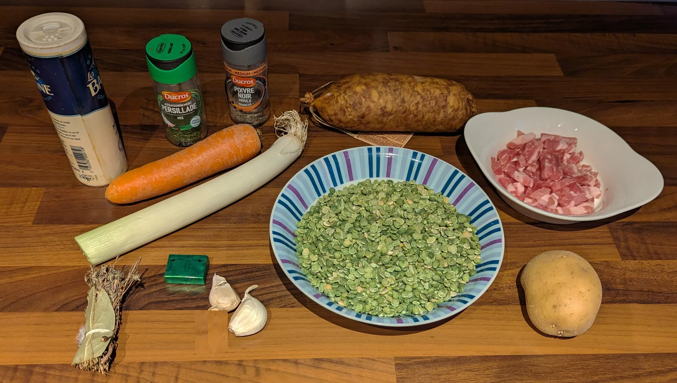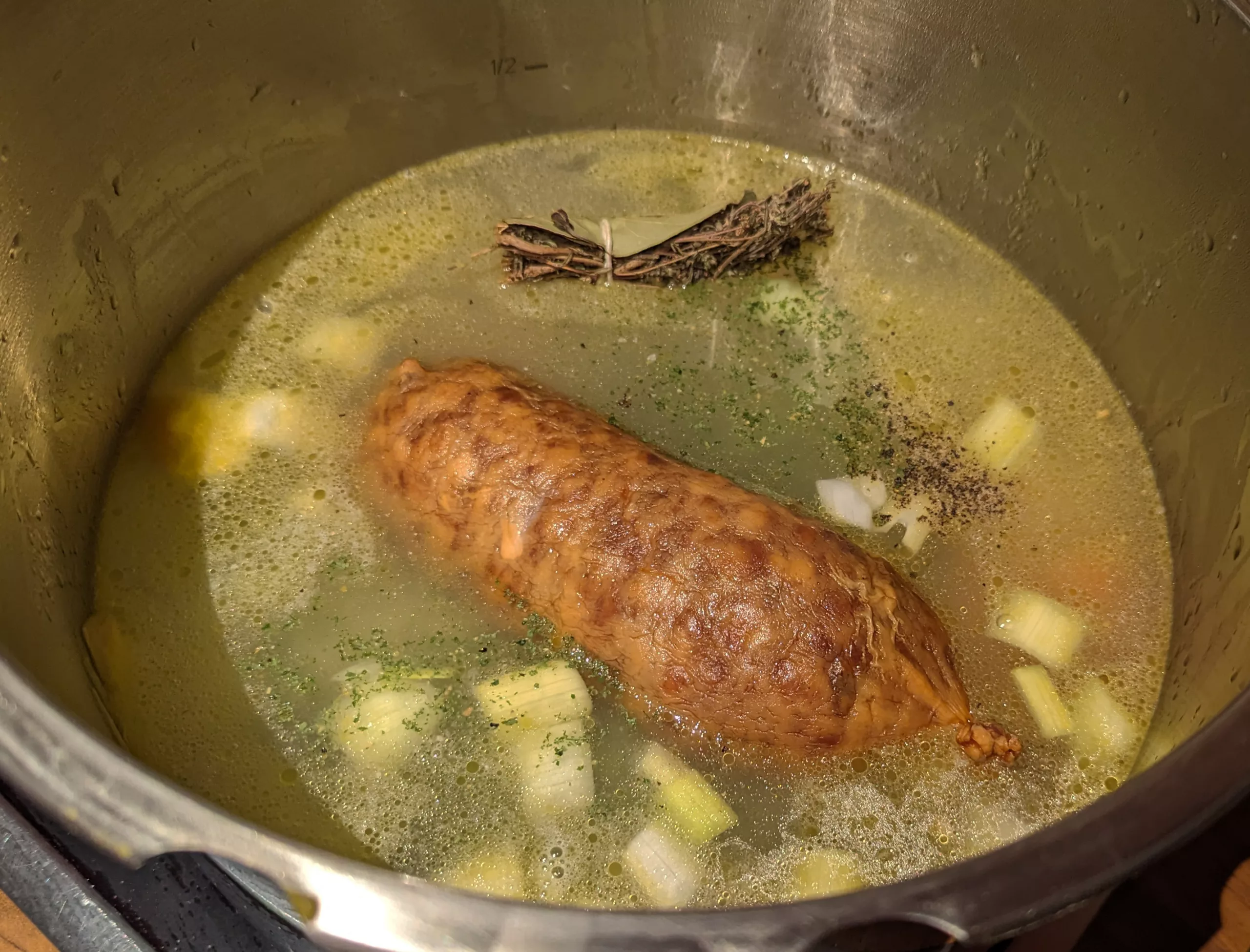 Verser ensuite l'eau. Rajouter les pois cassés, le cube de bouillon de volaille, le bouquet garni, le persil et le poivre. Déposer pour finir la saucisse de Morteau sans la percer.